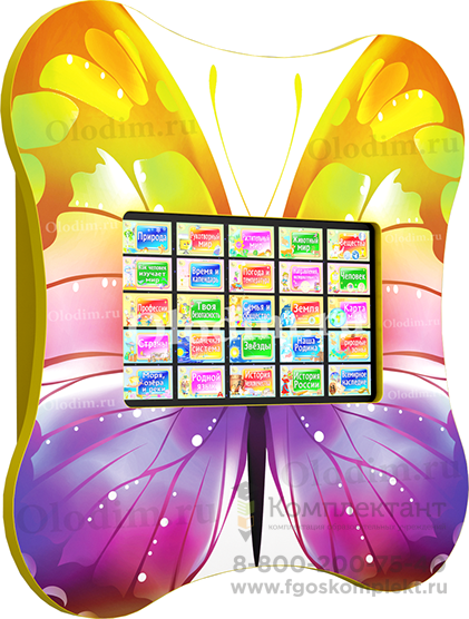 Это уникальный интерактивный игровой комплекс-трансформер. Интерактивный развивающий стол Бабочка, имеет яркий, красивый и запоминающийся дизайн, а так же лаконичную и практичную форму, которые никого не оставят равнодушным. Лицевая панель имеет травмобезопасные закругленные края. Интерфейсы, кнопки и разъемы, скрыты в недоступном для детей месте и закрываются на замок. Благодаря особой конструкции складных ножек, комплекс мгновенно превращается в интерактивный стол. Ножки стола — телескопические, позволяют легко подобрать оптимальную высоту стола под ростовую группу. В зависимости от формы и целей обучения, его легко можно использовать, и как интерактивный игровой терминал и как интерактивный стол, что имеет большое практическое значение. Данная модель производится в различных комплектациях, так что купить интерактивный стол от компании "Olodim" - Российского производителя интерактивных столов, может позволить себе, даже организация с очень скромным бюджетом.