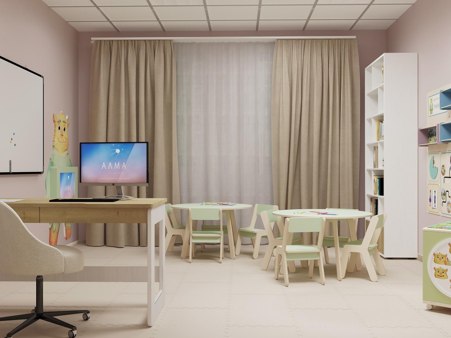 Комплект оборудования для кабинета английского языка рассчитан на занятия в группе 2-8 человек. Он включает рабочий стол специалиста, ПК с периферийными устройствами, 2 детских круглых стола и 8 стульчиков. Для хранения методической и художественной литературы есть 4 открытых стеллажа. Стены украшают декоративные панели, магнитно-маркерная доска для традиционной работы на уроке и дидактическая настенная панель English Buddy для визуального запоминания и закрепления знаний в дидактических играх.