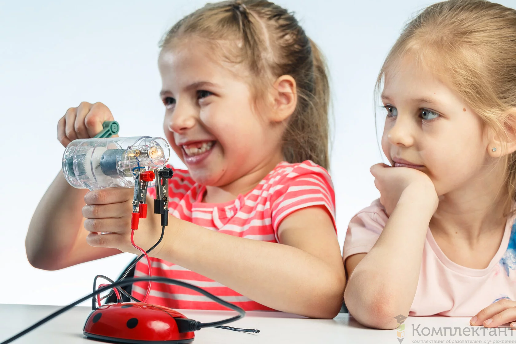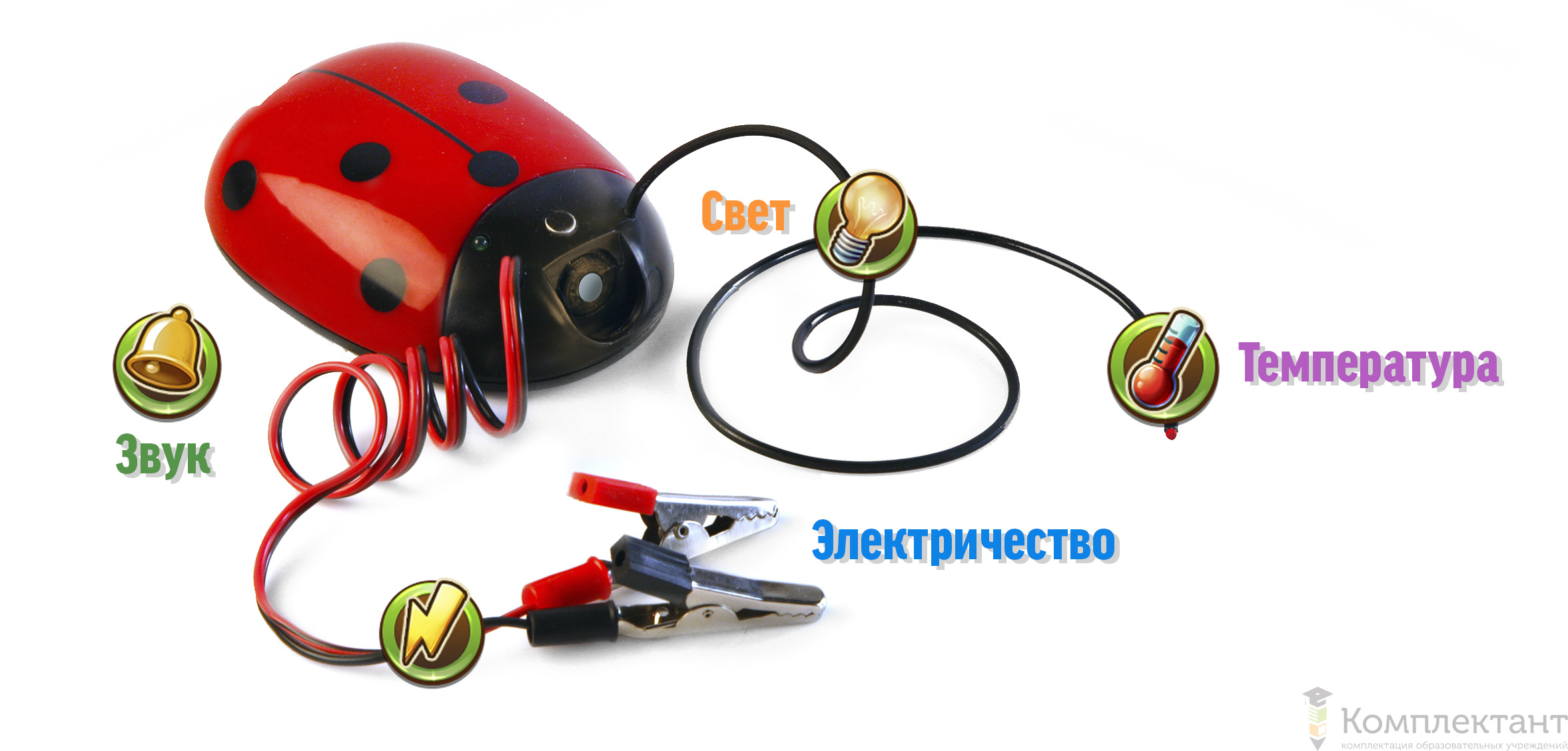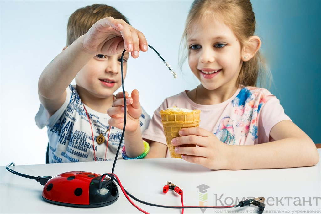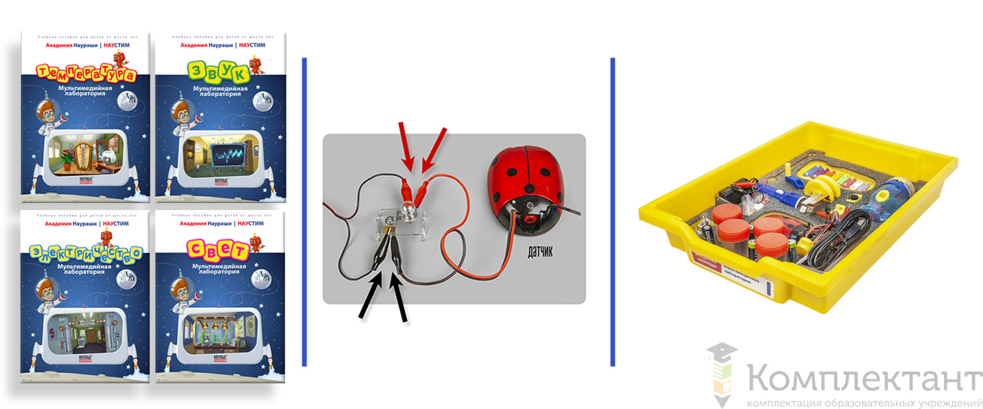 В ходе занятия с комплектом дети проводят эксперименты с использованием мультидатчика в виде «божьей коровки», а мультимедийный интерактивный герой Наураша ставит ребенку задачи и комментирует результаты экспериментов.