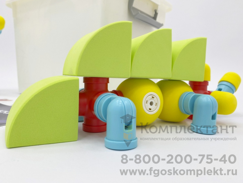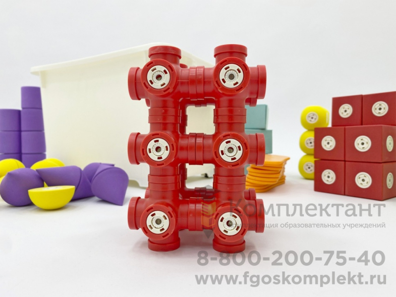 Детали конструктора окрашены в приятные однотонные цвета, со звуковым эффектом погремушки. Каждая из деталей имеет от 1 до 9 вариантов магнитной стыковки, что практически не ограничивает ребенка в конструировании. Простые детали отлично подходят для детей младшей группы ДОУ, детей с ОВЗ и РАС. Более сложные по форме и креплениям детали предназначены для детей средней и старшей группы.