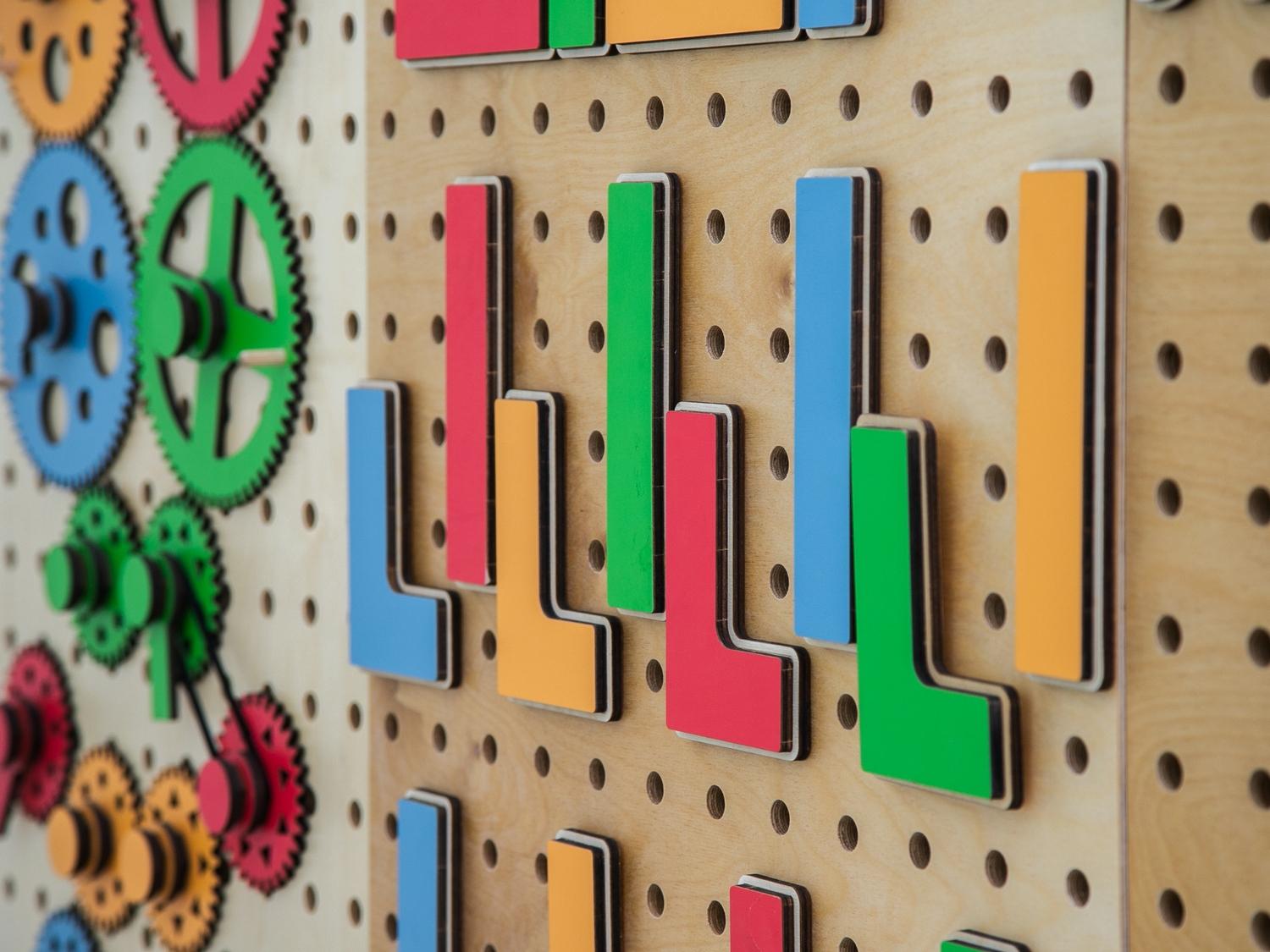Настенный «АЛМА STEM» - это деревянный настенный конструктор с разнообразными подвижными элементами, разработанный с учетом принципов STEM образования.