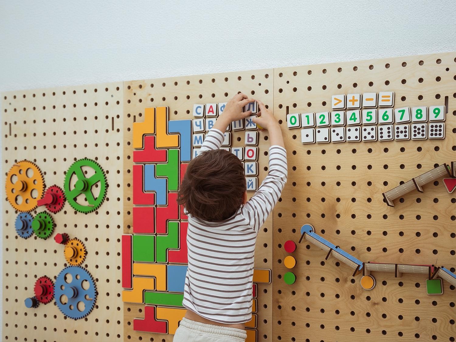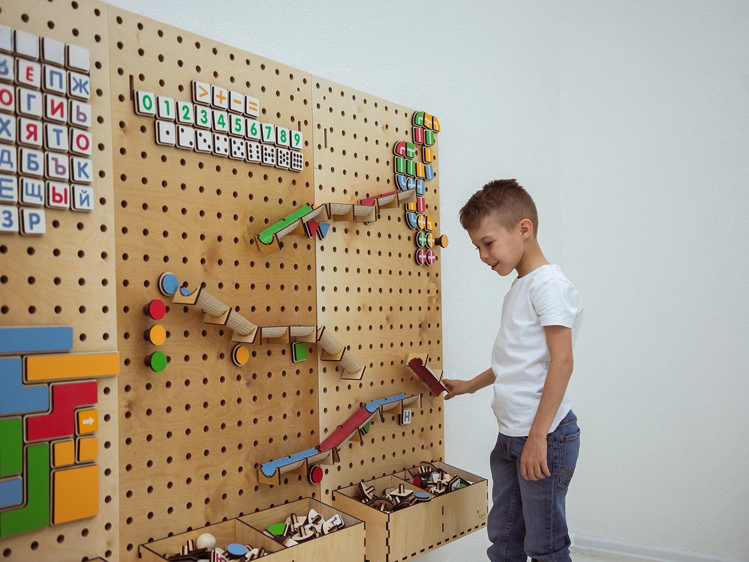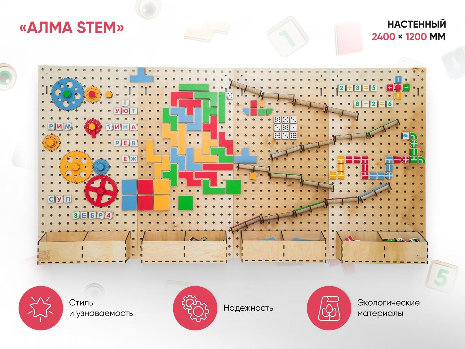 Настенный «АЛМА STEM» - это деревянный настенный конструктор с разнообразными подвижными элементами, разработанный с учетом принципов STEM образования: