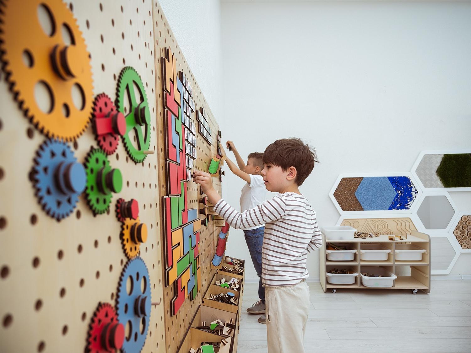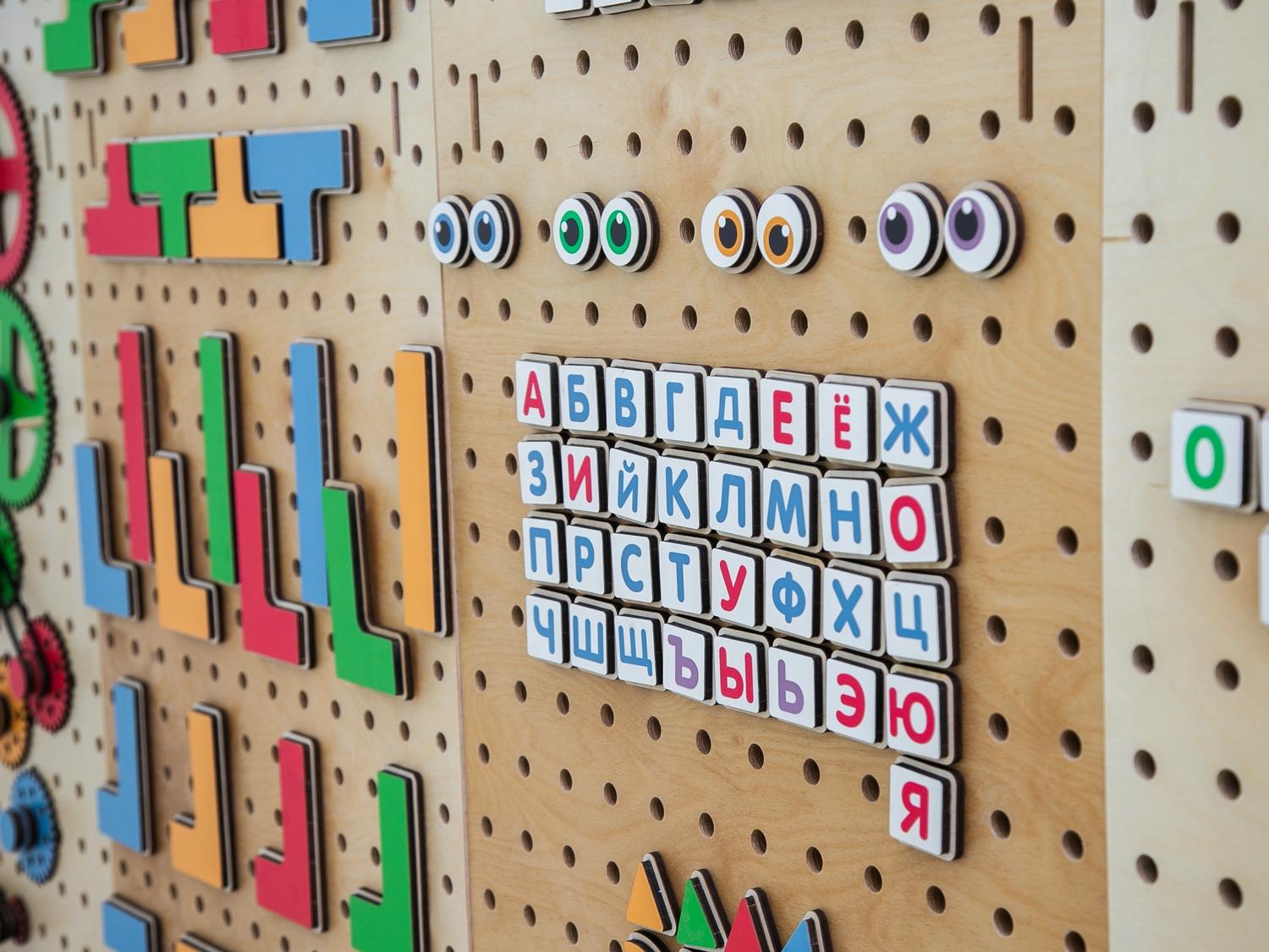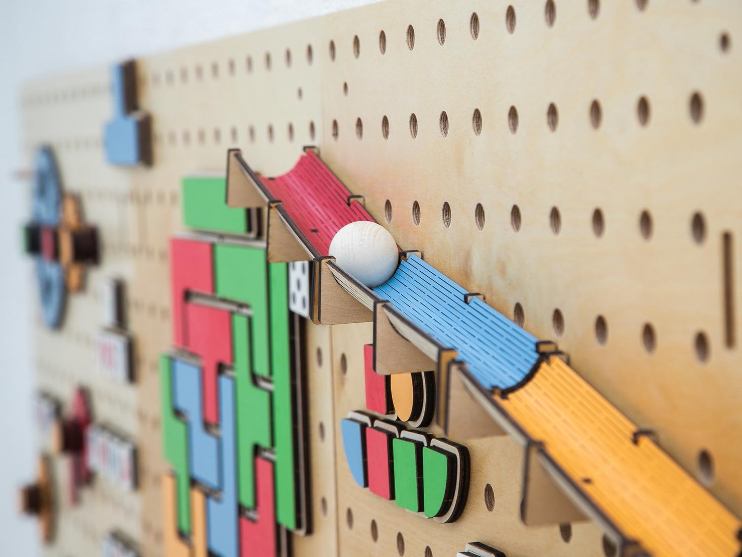 Настенный «АЛМА STEM» - это деревянный настенный конструктор с разнообразными подвижными элементами, разработанный с учетом принципов STEM образования: