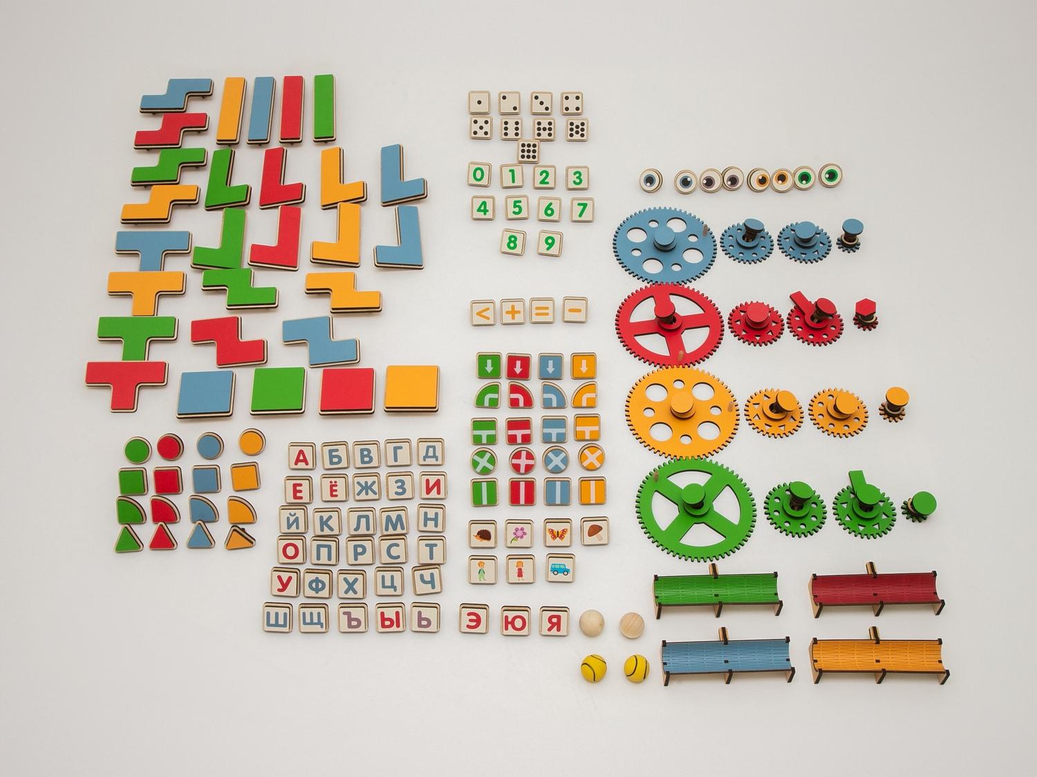 Панель «АЛМА STEM» состоит из фирменных деревянных платформ-оснований и цветных дидактических элементов для конструирования и моделирования.