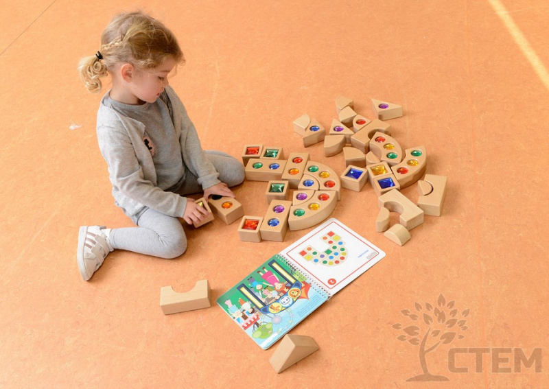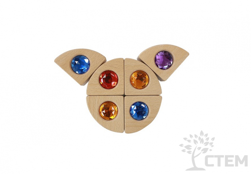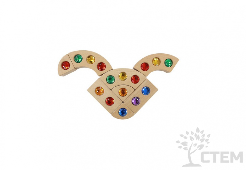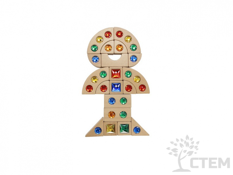Игровой набор состоит из 40 блоков, изготовленных из бука, инкрустированных красочными акриловыми "драгоценными" камнями в 5 ярких цветах (красный, синий, фиолетовый, зеленый, желтый).