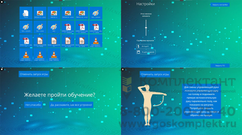 Управление всеми приложениями внутри программной оболочки "Olodim Active" осуществляется с помощью пространственного датчика-детектора движений, который подключается к управляющему компьютеру.