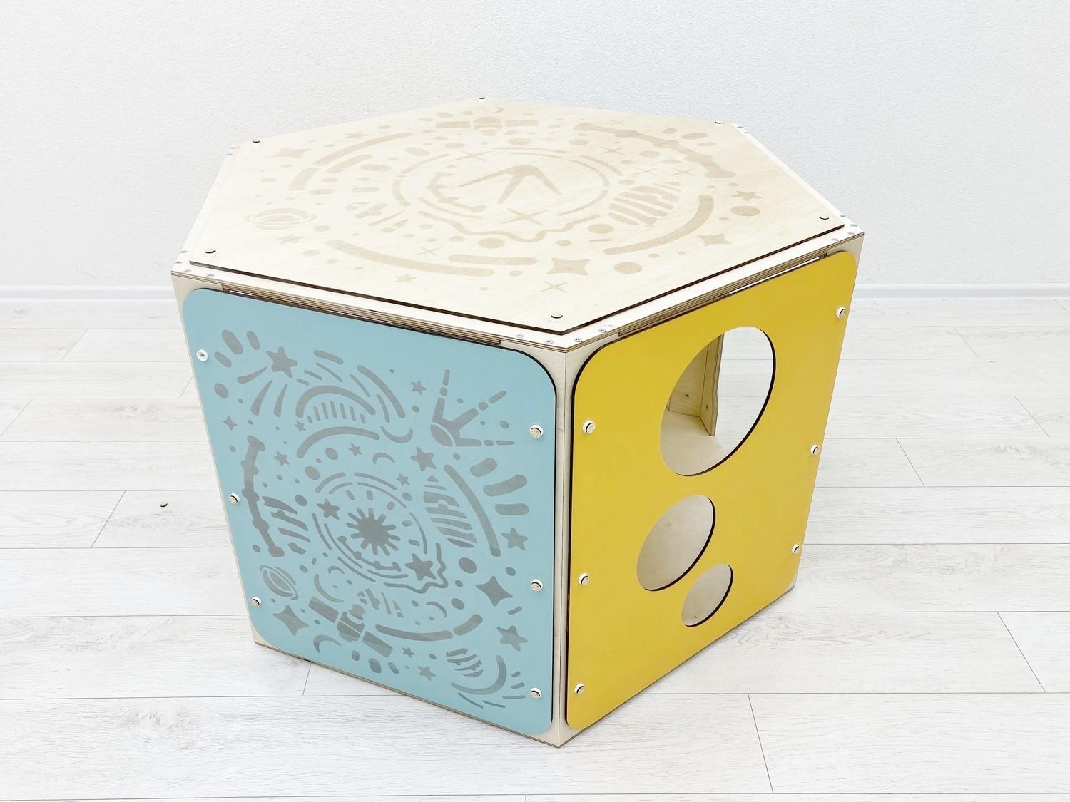 Внутри модули украшены тактильными панелями для развития сенсорной чувствительности, а снаружи – лазерной гравировкой и фигурными окошками. Они идеально стыкуются между собой и позволяют конструировать из них замки и лабиринты для маленьких непосед.