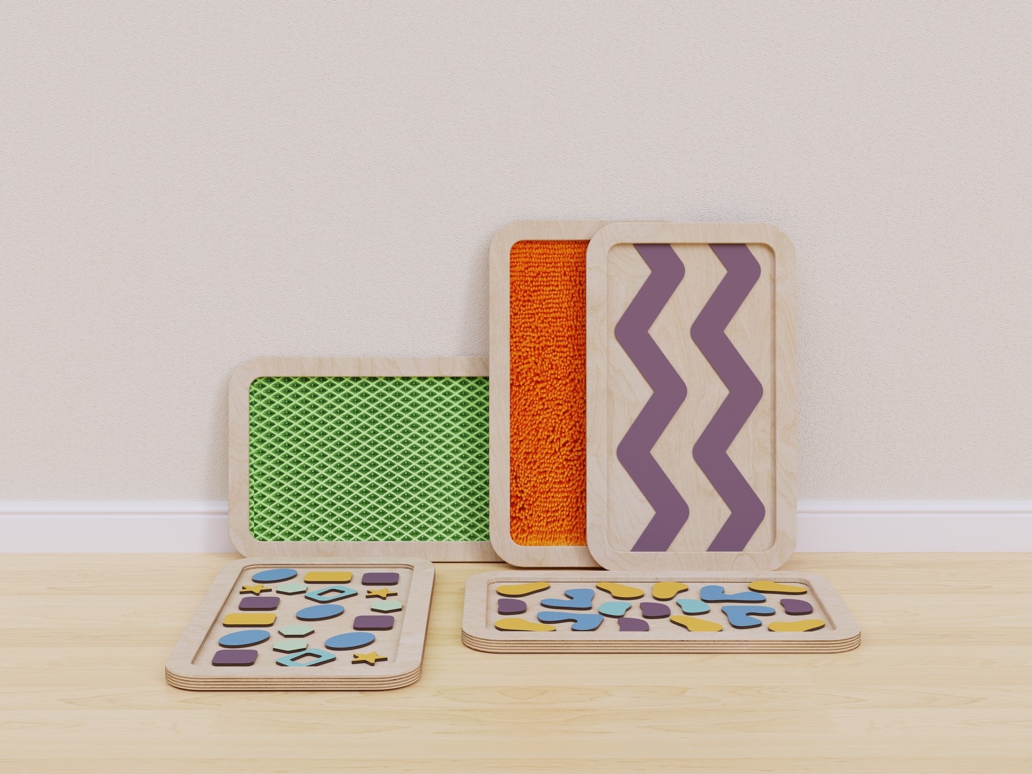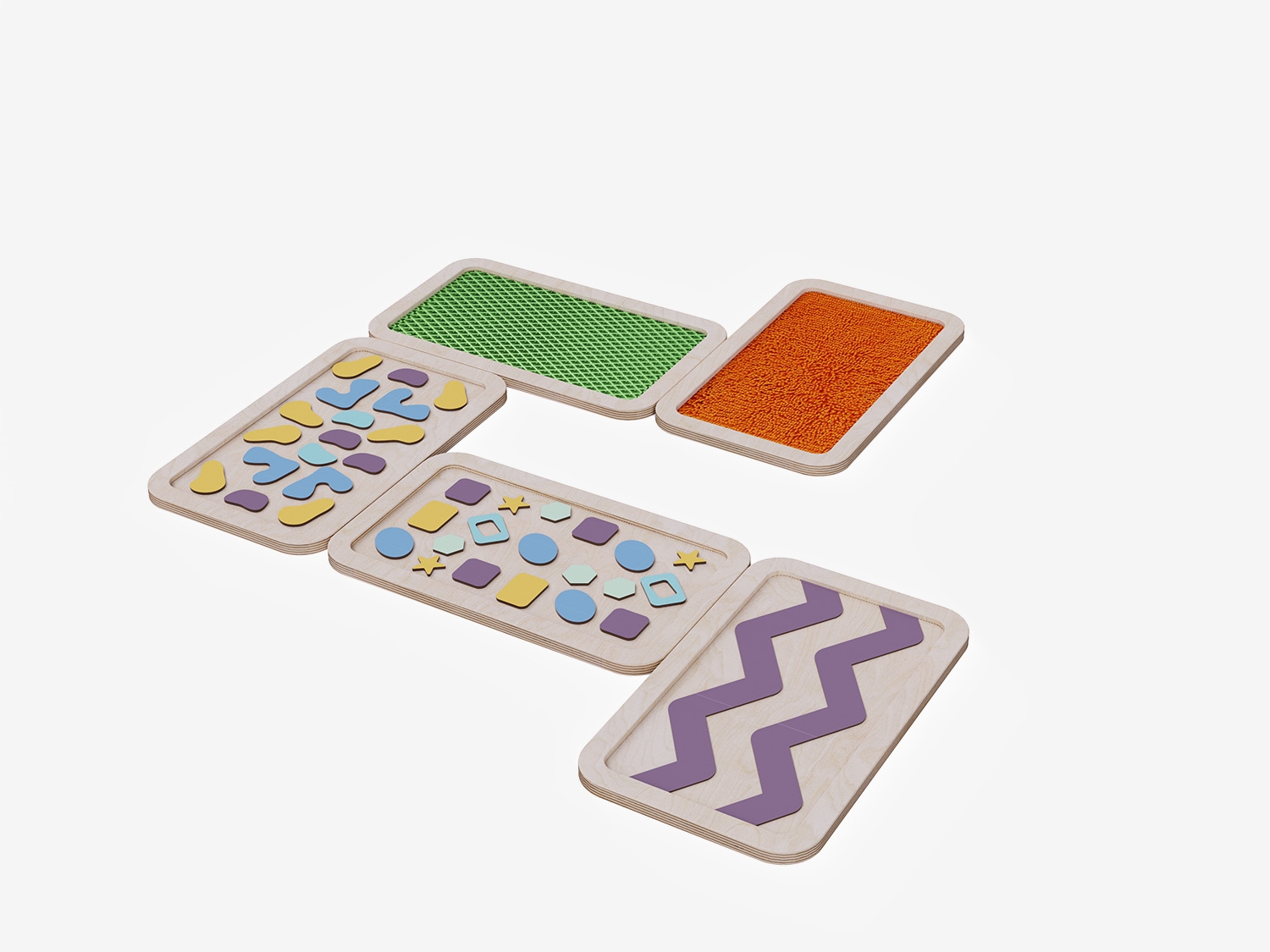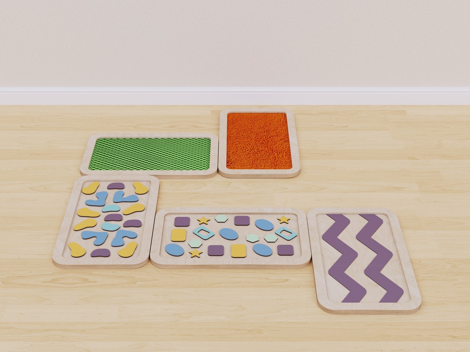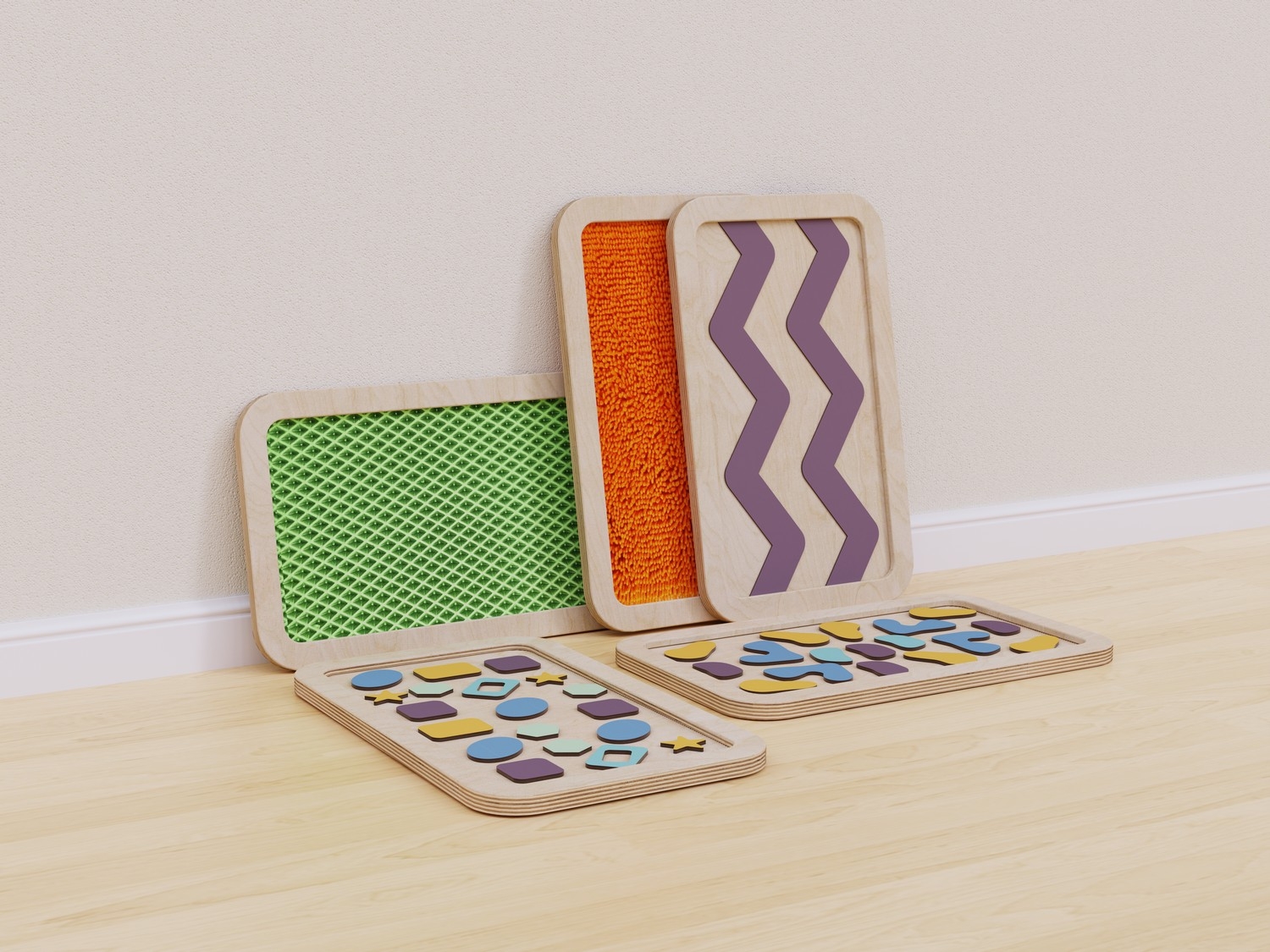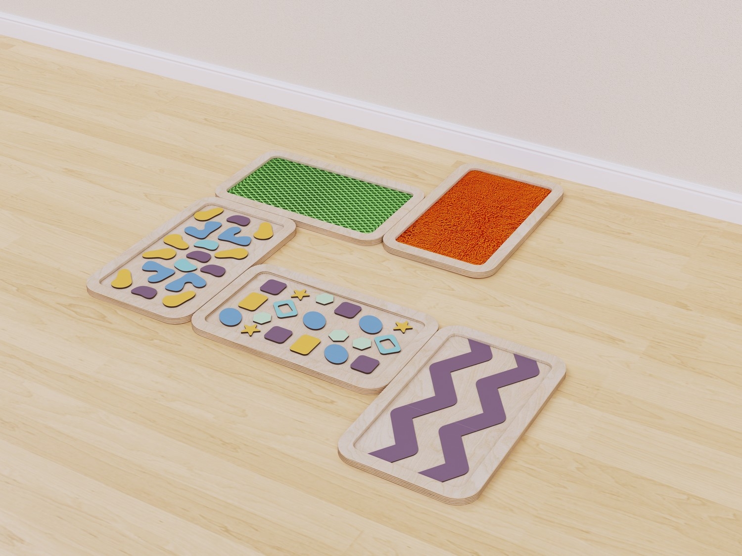 Набор состоит из пяти панелей с тактильными поверхностями разного типа: