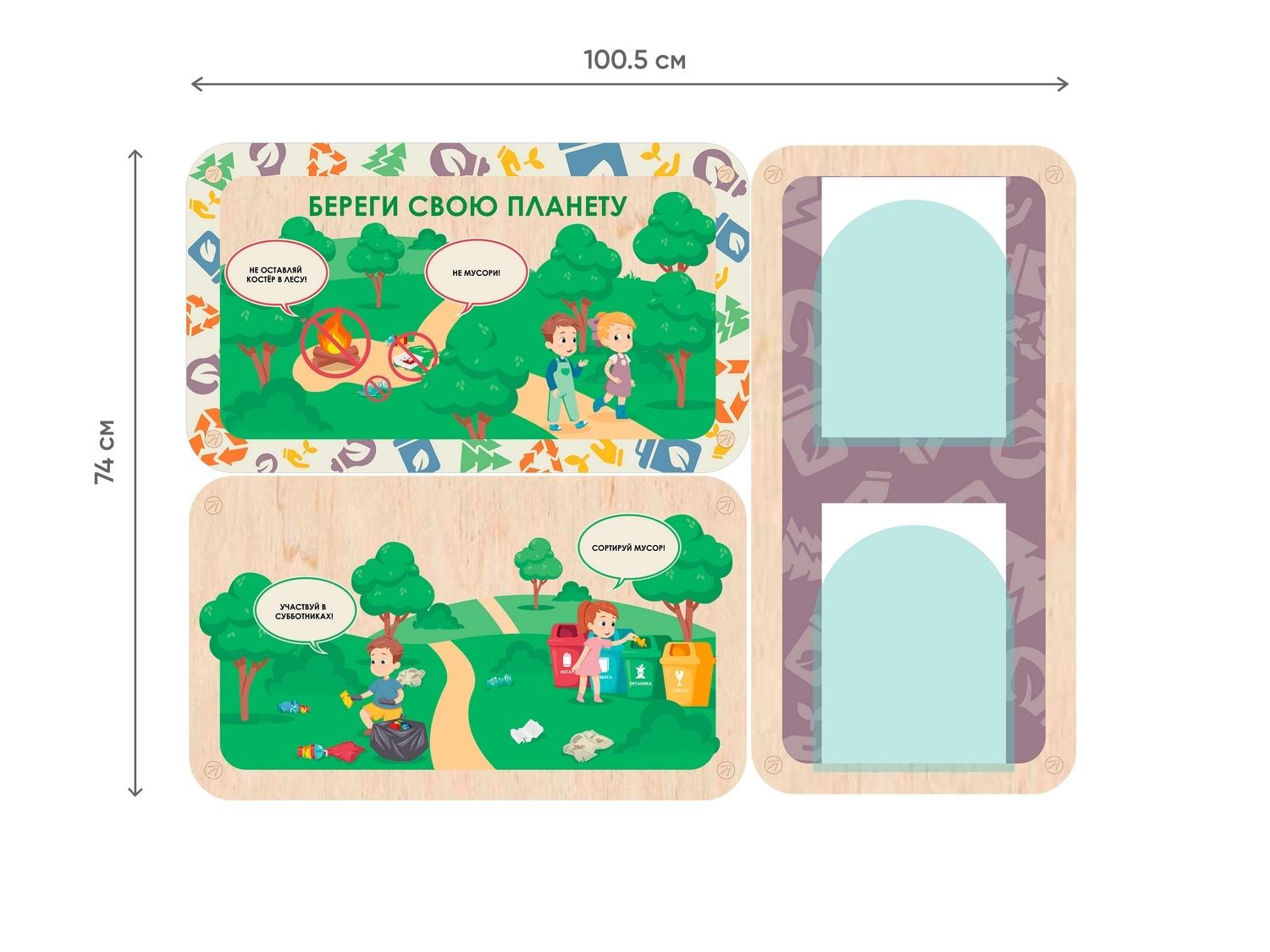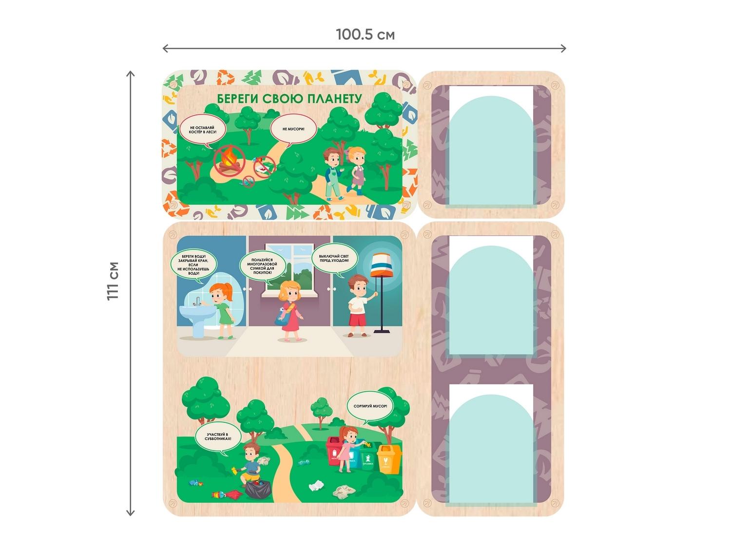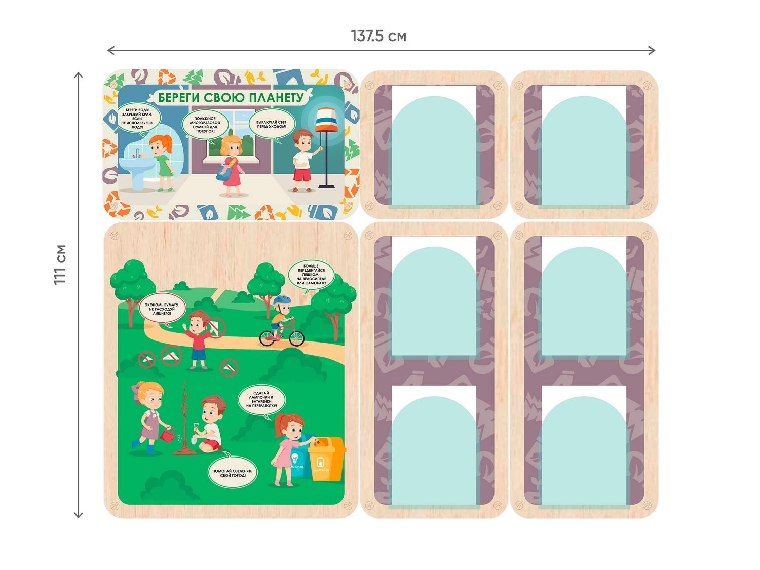 Информационный стенд для оформления стен в детских садах, начальной школе и организациях дополнительного образования. Красочные наглядные иллюстрации с простыми подписями помогут дошколятам понять правила экологичного поведения, даже если они ещё не умеют читать. Важная информация для родителей может размещаться в акриловых карманах около каждого стенда.