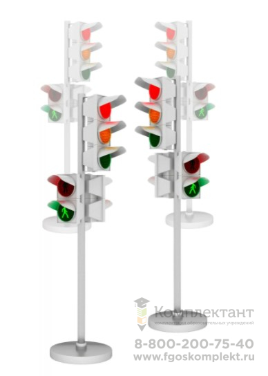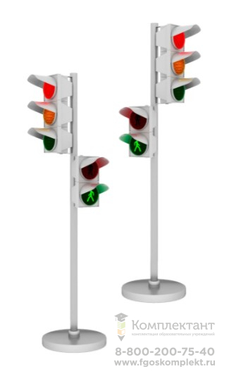 Комплектация:  Набор светодиодных светофоров "Четырехсторонний перекресток" мобильный, Набор светодиодных светофоров "Пешеходный переход" мобильный,  Светофор "ЖД переезд" мобильный светодиодный двухсигнальный,