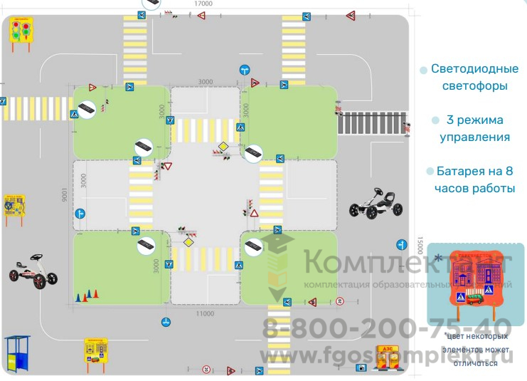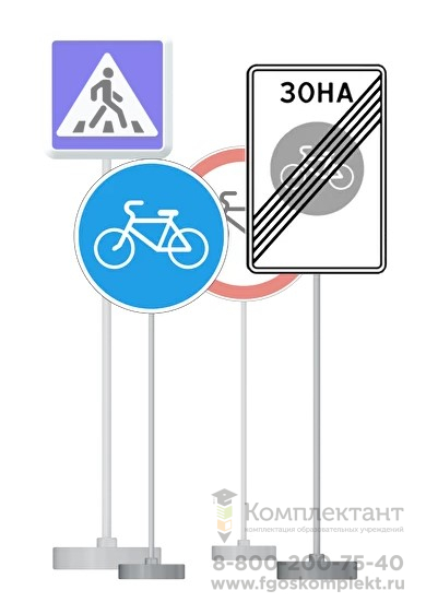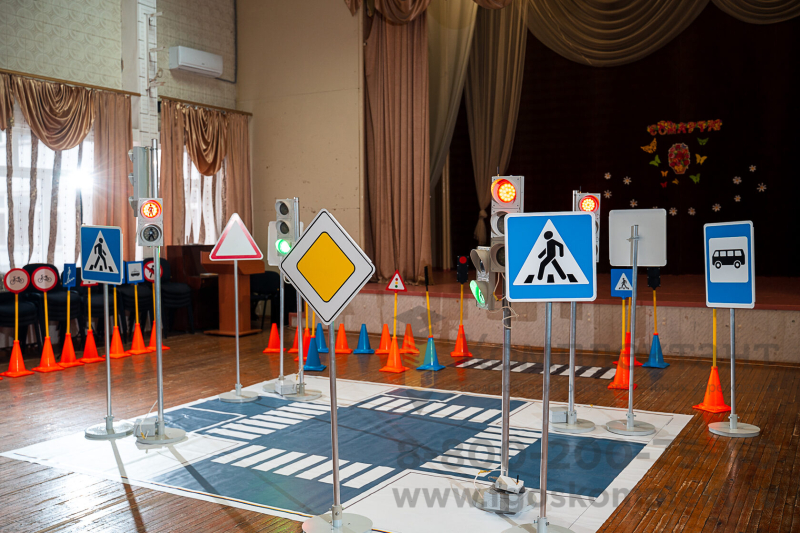 4. Знак дорожный типоразмер 40 на стойке с основанием, Имитация четырёхстороннего перекрестка 11*9м, Учебно-игровой макет "Пост ДПС" , Учебно-игровой макет "Заправка" АЗС (мобильный/стационарный), Бизи-стенд "Светофоры",  Бизи-стенд "Перекресток" -, Бизи-стенд "Дорога в школу", Медаль для вручения по результатам изучения ПДД, Набор ролевых жилетов,  Учебно-методический плакат "Правила безопасности для пешехода",  Учебно-методический плакат "Дорожные знаки пешеходу", Учебно-методический плакат "Дорожные знаки водителю", Жезл регулировщика детский, Веломобили.