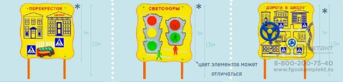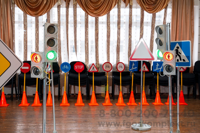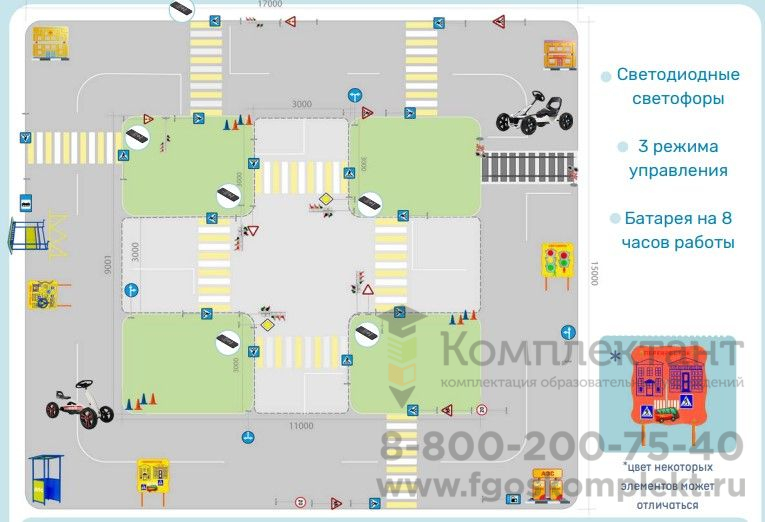 Комплектация: Набор светодиодных светофоров "Четырехсторонний перекресток" мобильный,  Набор светодиодных светофоров "Пешеходный переход" мобильный, Светофор "ЖД переезд" мобильный , Знак дорожный типоразмер 40 на стойке ,  Имитация четырёхстороннего перекрестка, Учебно-игровой макет "Пост ДПС", Учебно-игровой макет "Заправка" АЗС, Бизи-стенд "Перекресток", Бизи-стенд "Дорога в школу", Учебно-игровой макет "Детский сад/Школа", Учебно-игровой макет "Больница", Учебно-игровой макет "Остановка"(мобильный/стационарный),  Учебно-методический плакат "Правила безопасности для пешехода", Учебно-методический плакат "Дорожные знаки пешеходу", Учебно-методический плакат "Дорожные знаки водителю",  Жезл регулировщика детский,  Набор конусов сигнальных 33 см,  Набор ролевых жилетов, Веломобили - 2 шт