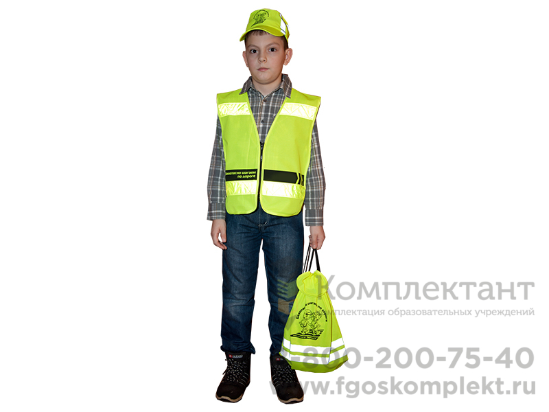 Световозвращающий жилет представляет собой одежду без рукавов желтого цвета на молнии с четырьмя световозвращающими полосками. На спине жилета нанесены рисунок и слоган. По бокам расположены эластичные ленты черного цвета, которые позволяют варьировать жилет по размеру для детей разного возраста и телосложения.