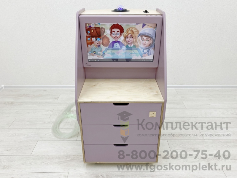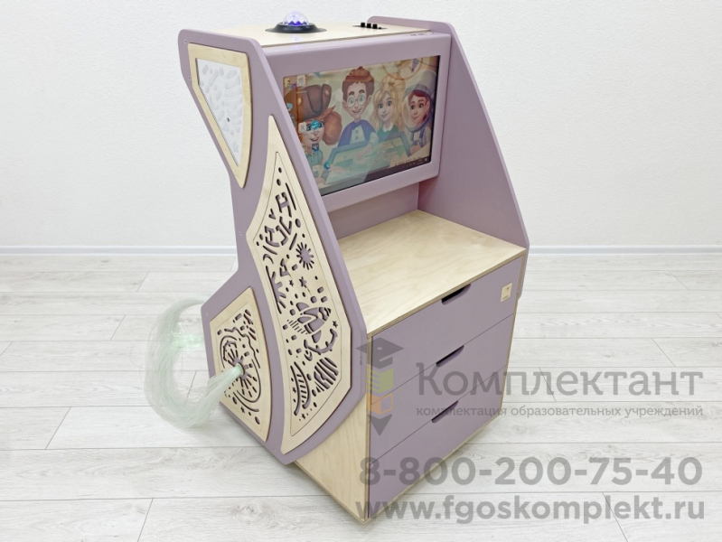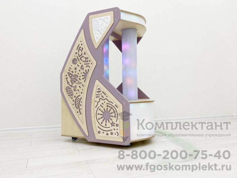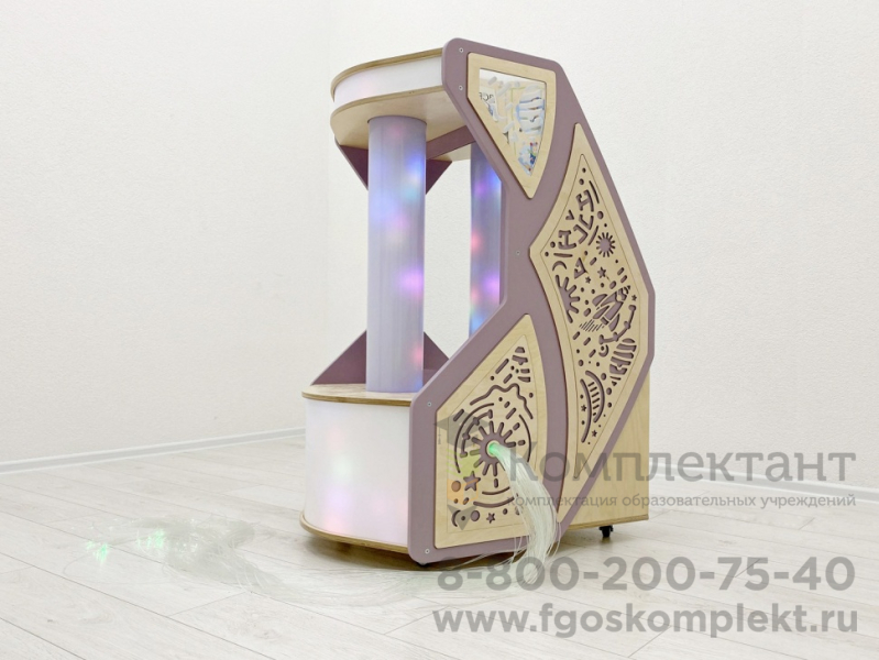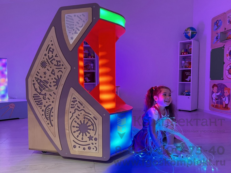 Универсальное оборудование для оснащения сенсорных комнат в детских садах и кабинетов детских психологов. Мобильный комплекс включает: мультимедийную сенсорную панель с профессиональным ПО «Профиль психолога АЛМА», световую колонну, фонтан из фибероптического волокна, сенсорные панели, проектор звёздного неба и встроенную музыкальную систему.