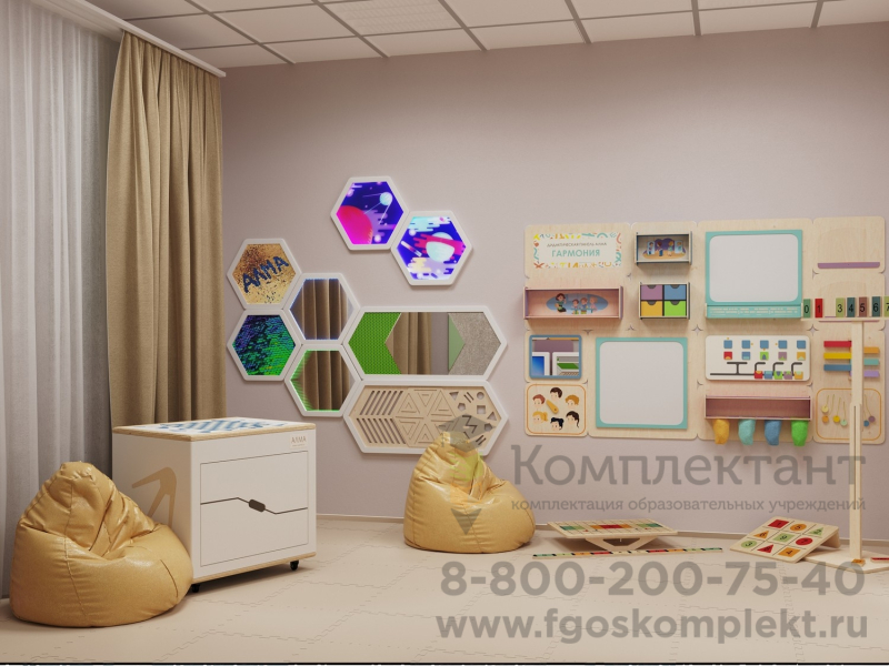 Готовый комплект содержит: стол психолога-дефектолога, рабочий стол для детей, компьютер специалиста с программным обеспечением для психологов «Профиль психолога АЛМА», интерактивную сенсорную панель с набором общеразвивающих программ для дошкольников, дидактическую панель «Гармония», кресла-мешки, набор корпусной мебели, нейротренажеры, методические материалы, обучающие пособия и многое другое.