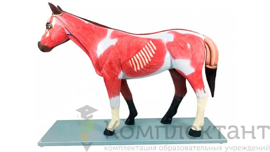 Данный учебный комплекс предназначен для подготовки специалистов ветеринарного профиля и позволяет отработать общие вопросы внешнего и внутреннего анатомического строения Лошади, а также строение внутренних органов и их расположение. Данный стенд представляет из себя модель Лошади из пластика, установленную на основании в масштабе. Внутренние органы Лошади, выполненные из пластика, могут быть закреплены внутри туловища на магнитные держатели. Макет оснащен специализированными метками на каждом из органов, при поднесении специализированного считывателя начинается воспроизведение звукового фрагмента с описанием строения данного органа на русском языке а также открывается трехмерное изображение данной структуры в виртуальном атласе анатомии животного на ПК. Также в комплекте поставляется виртуальный обучающий комплекс с цифровым двойником организма Лошади с возможностью изучения анатомии и морфологии организма животного на виртуальной модели.