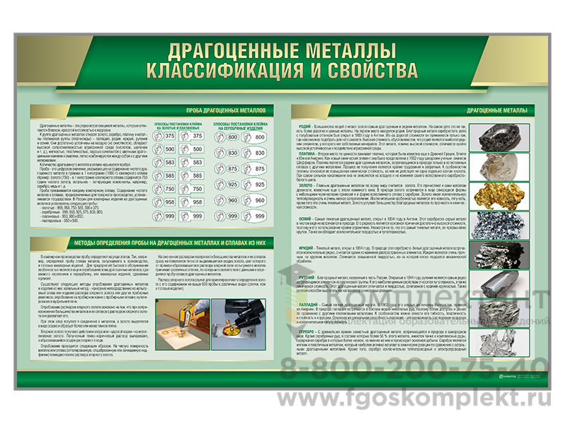 Стенд представляет собой полноцветную информационную панель, на которой изображены отдельные виды драгоценных металлов, описаны их характерные свойства, а также раскрыты методы определения проб на некоторых драгоценных металлах и сплавах из них.