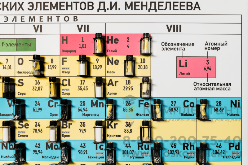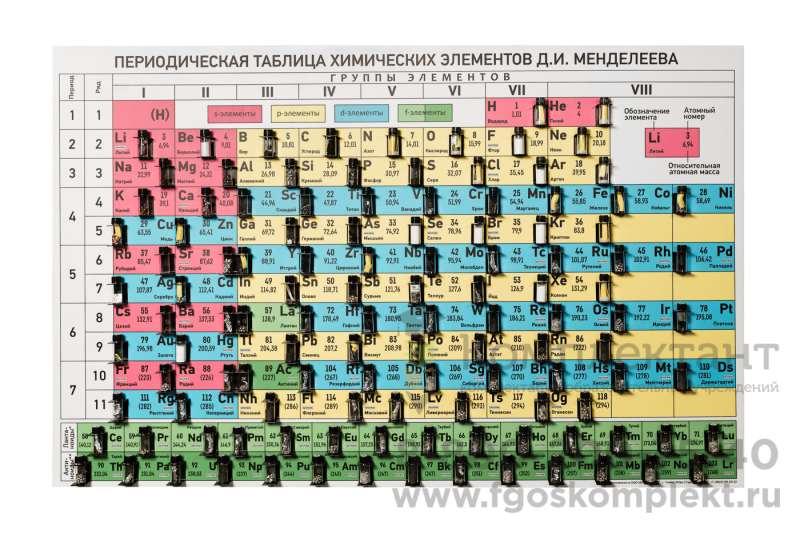 Периодическая таблица Д.И. Менделеева, с образцами химических элементов, предназначена для изучения периодического закона, химических элементов и их свойств в рамках дисциплин естественнонаучного цикла.