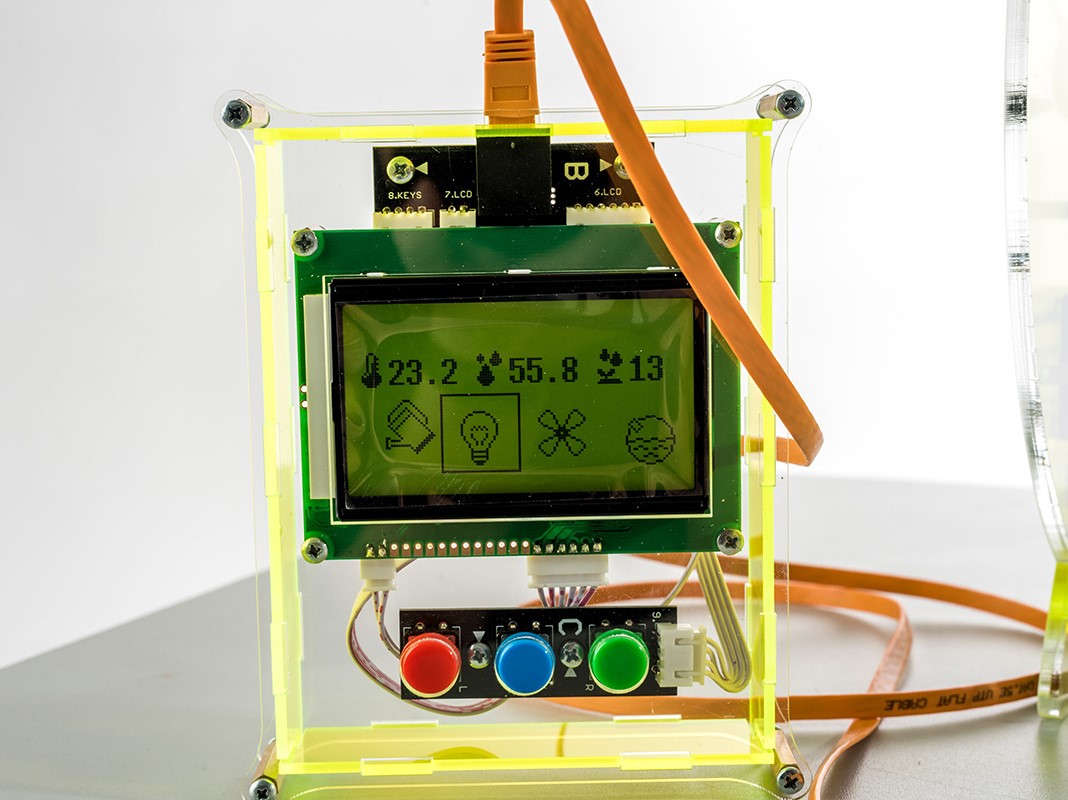 - Показания датчиков отображаются на ЖК дисплее: температура воздуха в ℃, влажность воздуха в % и влажность почвы в %.