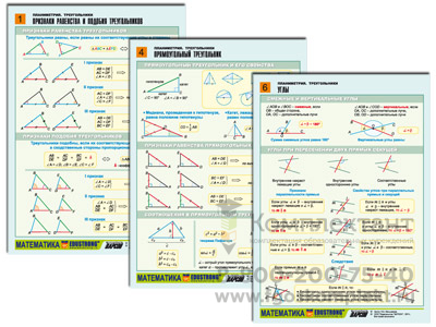 Пособие предназначено для использования в качестве раздаточного материала на уроках геометрии. Габаритные размеры в упаковке (дл.*шир.*выс.), см: 30*21*0,5. Вес, кг, не более 0,1. Пособие состоит из 6 полноцветных таблиц формата А4, ламинированных глянцевой пленкой: 1. Признаки равенства и подобия треугольников. 2. Произвольный треугольник. 3. Равнобедренный и равносторонний треугольники. 4. Прямоугольный треугольник. 5. Площадь треугольника. 6. Углы.