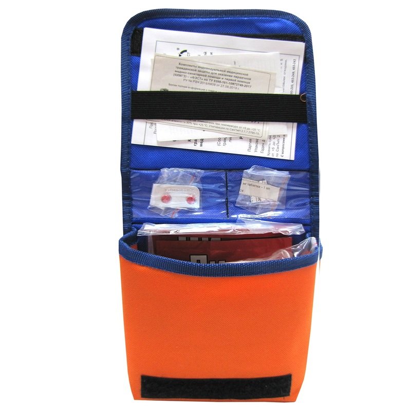 Комплект медицинский гражданской защиты КИМГЗ укомплектован в соответствии с приказом Министерства здравоохранения РФ от 15 февраля 2013г. № 70н Об утверждении требований к комплектации медицинскими препаратами и медицинскими изделиями КИМГЗ для оказания первичной медико-санитарной помощи и первой помощи" и приказом Министерства РФ по делам гражданской обороны, чрезвычайным ситуациям и ликвидации последствий стихийных бедствий от 23.01.2014 г № 23 «О внесении изменений в приказ МЧС России от 01.11.2006 № 633 и признании утратившим силу приказа МЧС России от 25.05.2007 № 289. Размер футляра: 155x185x70 мм. КИМГЗ, которым обеспечивается личный Состав: формирований, выполняющий задачи в районах возможного биозагрязнения (заражения), комплектуется: