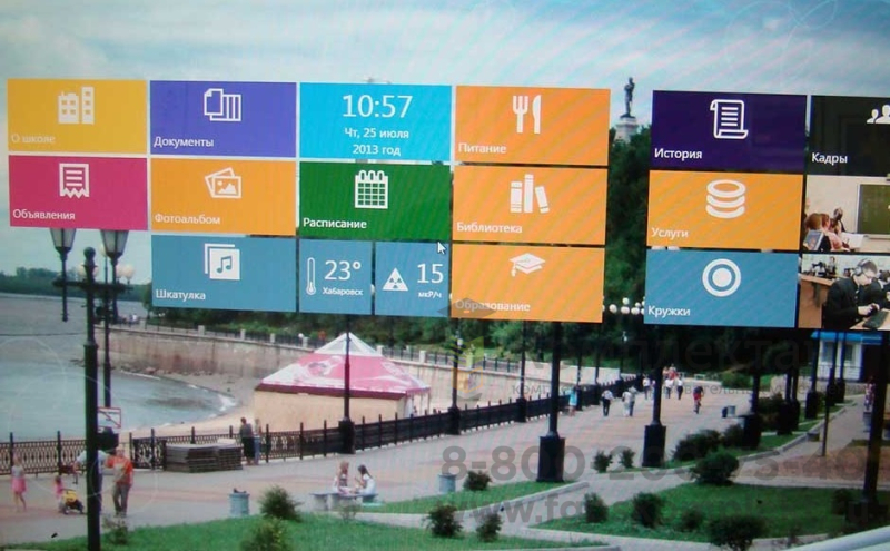 • с экрана киоска можно показывать видеоряд, фотографии и презентации о событиях в школе, общественной деятельности и праздниках
