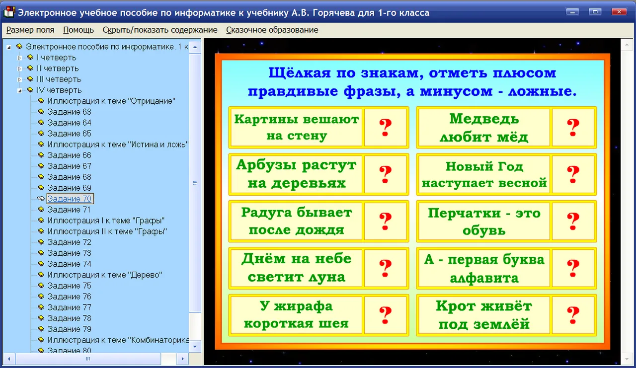 Электронное пособие по информатике для 1 класса к учебнику А.В. Горячева и др. позволяет проверить знания ребёнка, помочь ему понять изучаемые в начальной школе разделы информатики и потренировать в выполнении всех типов встречающихся заданий.