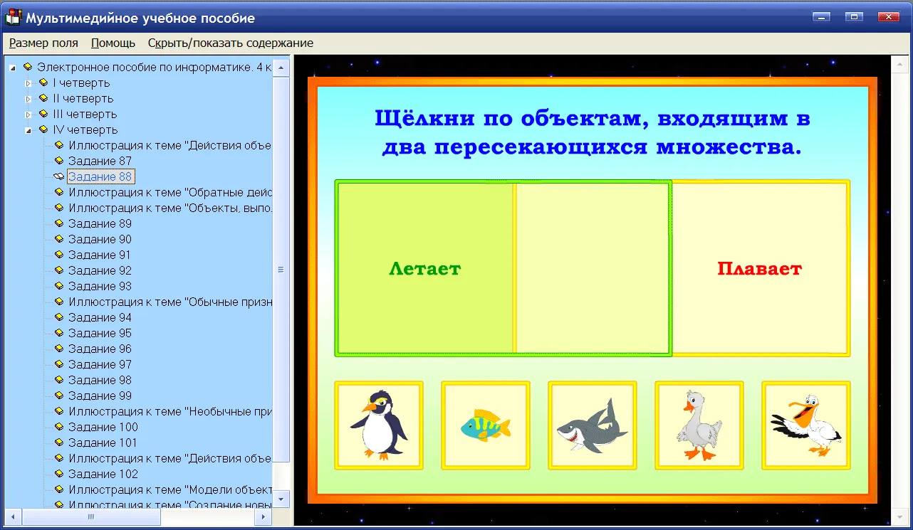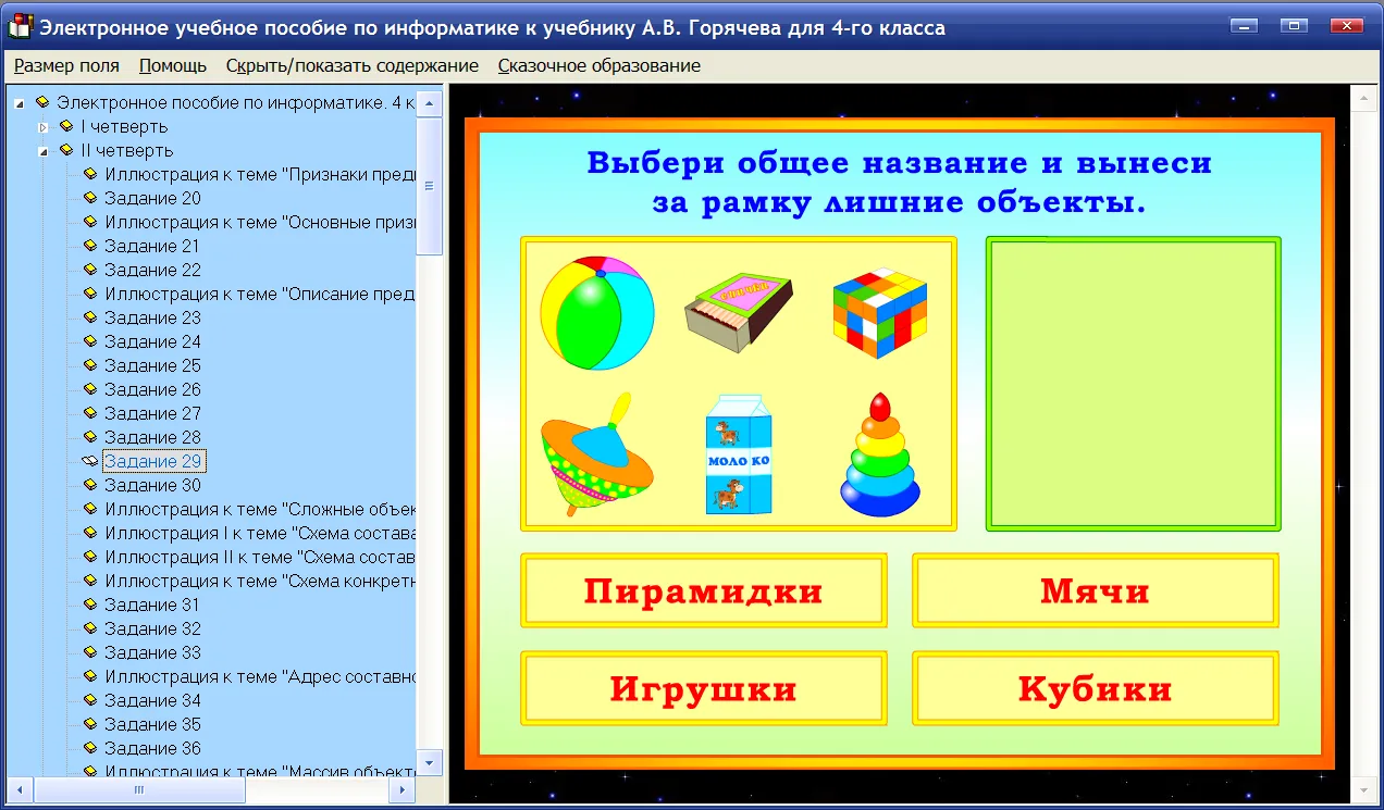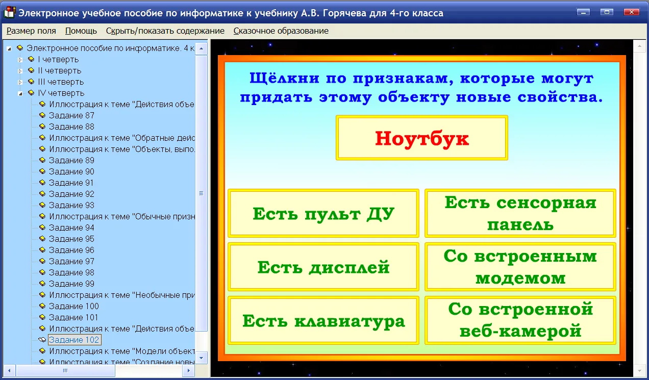 Электронное пособие по информатике для 4 класса к учебнику А.В. Горячева и др. позволяет проверить знания ребёнка, помочь ему понять изучаемые в начальной школе разделы информатики и потренировать в выполнении всех типов встречающихся заданий.