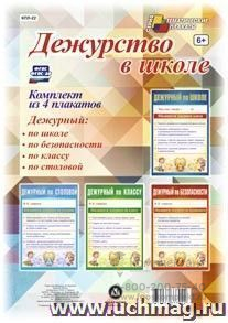 Комплект плакатов "Дежурство в школе" (4 плаката "Дежурный по школе", "Дежурный по классу", "Дежурный по безопасности", "Дежурный по столовой"): формат А4