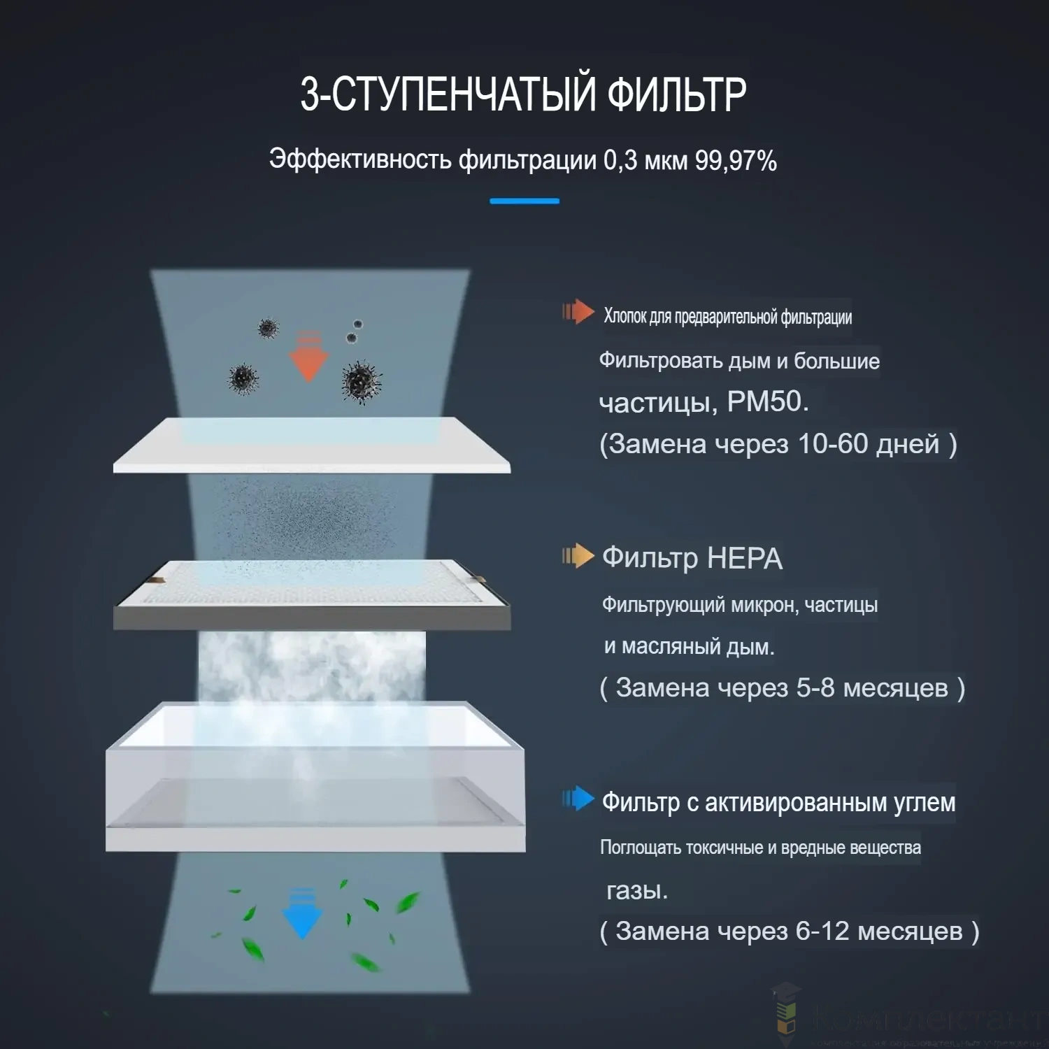 • 3-слойная фильтрация и 99,97% степень удаления дыма: с предварительным фильтром, расширенным фильтром и основным фильтром вытяжная система эффективно очищает воздух, достигая степени очистки до 99,97%.