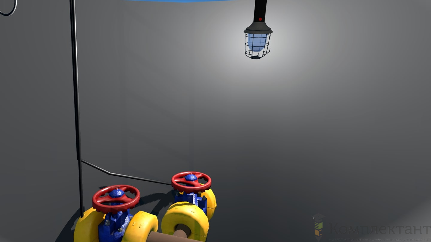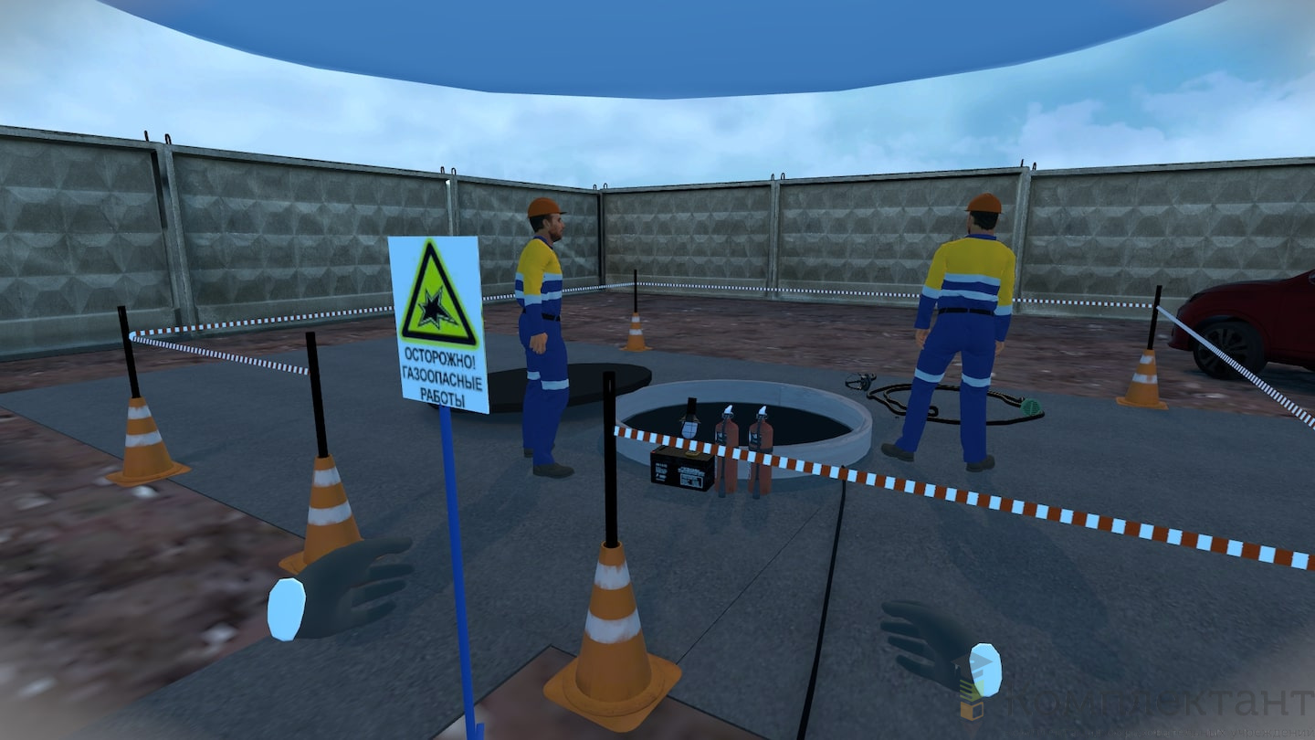 Виртуальный (VR) тренажер «Газоопасные работы» воссоздает ситуацию, в которой пользователь попадает в колодец глубиной 4 метра, где ему необходимо провести осмотр трубы, используя газоанализатор и противогаз, в условиях недостатка кислорода и наличия взрывопожароопасных загрязнителей в воздухе. В симуляции можно задать дополнительное условие: допуск с неполным комплектом.