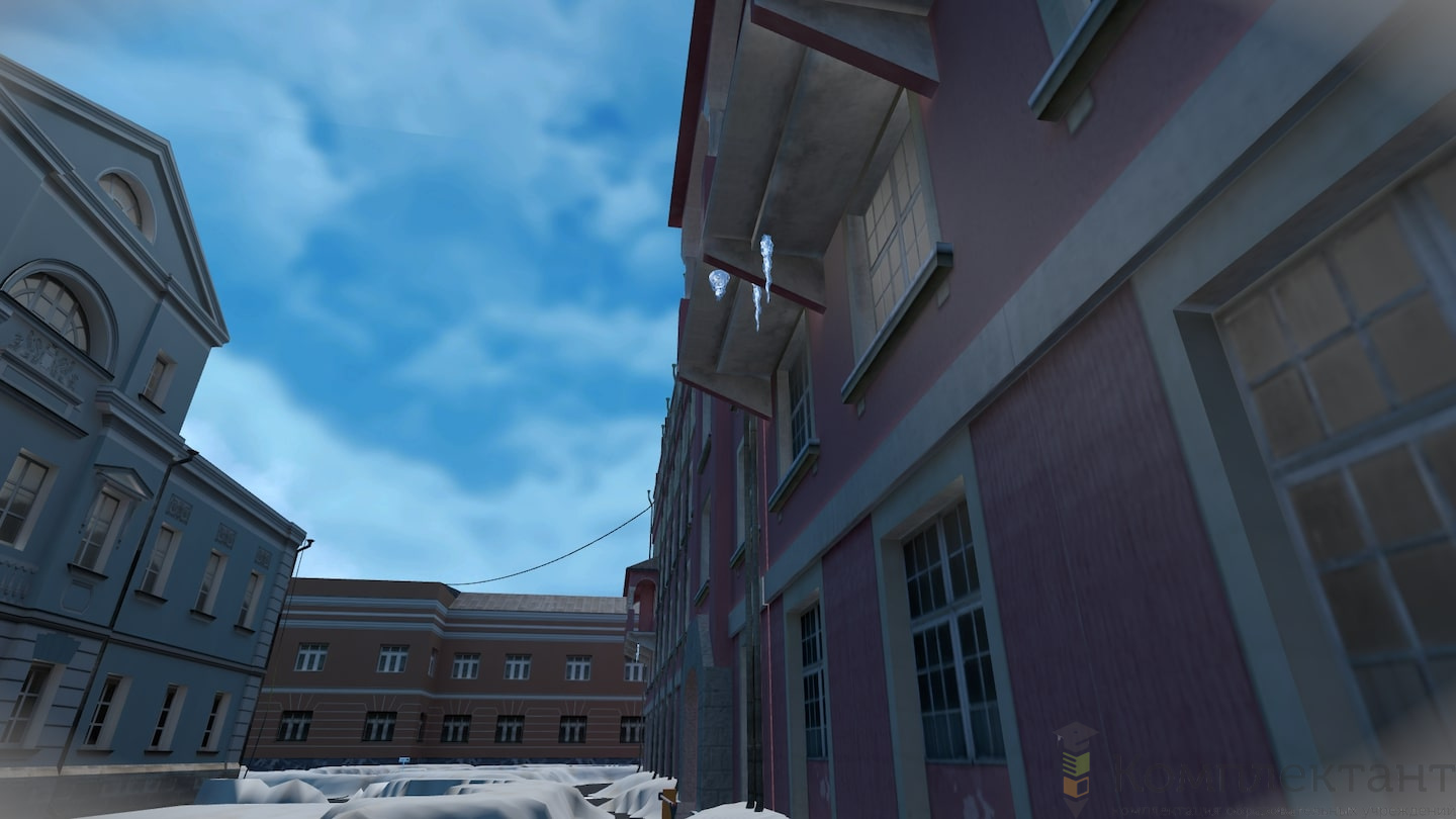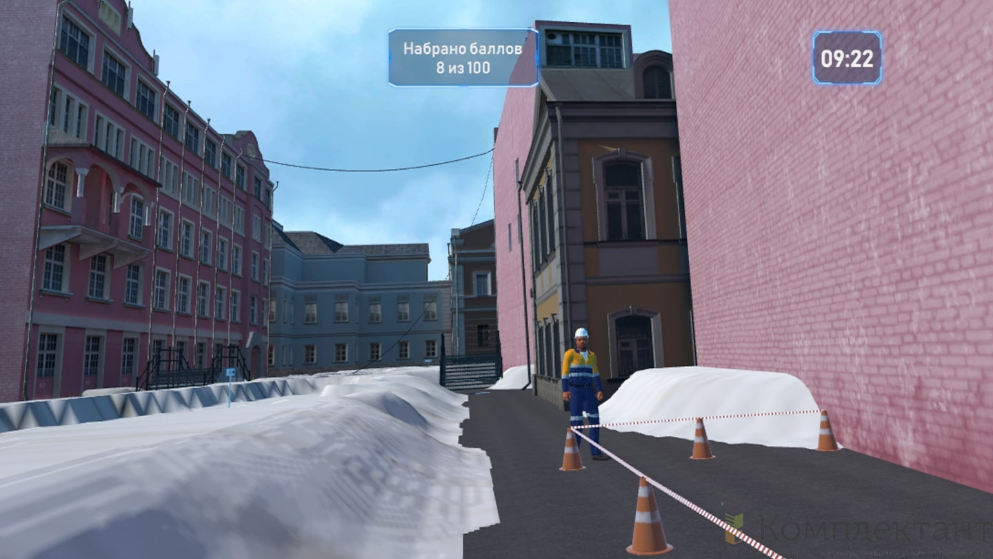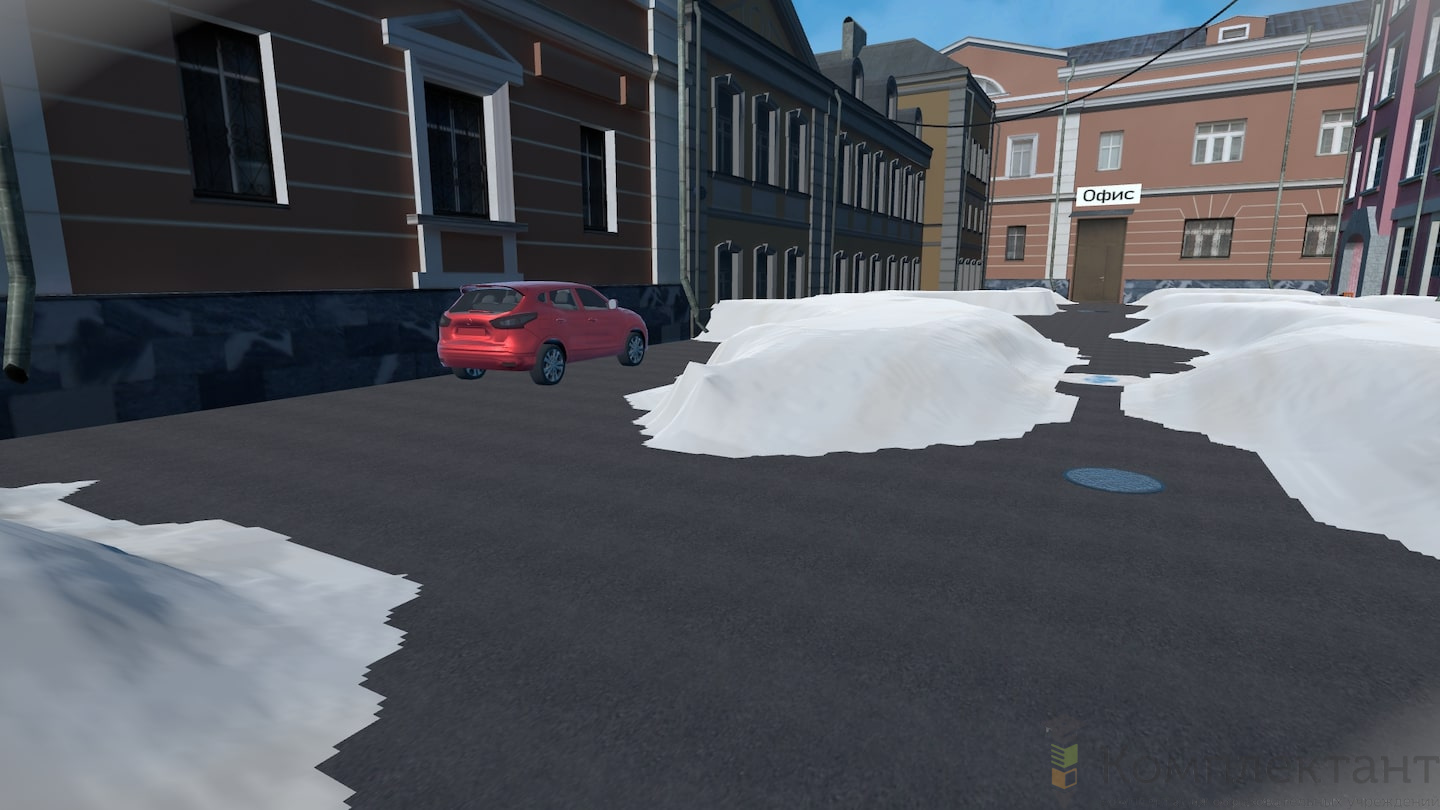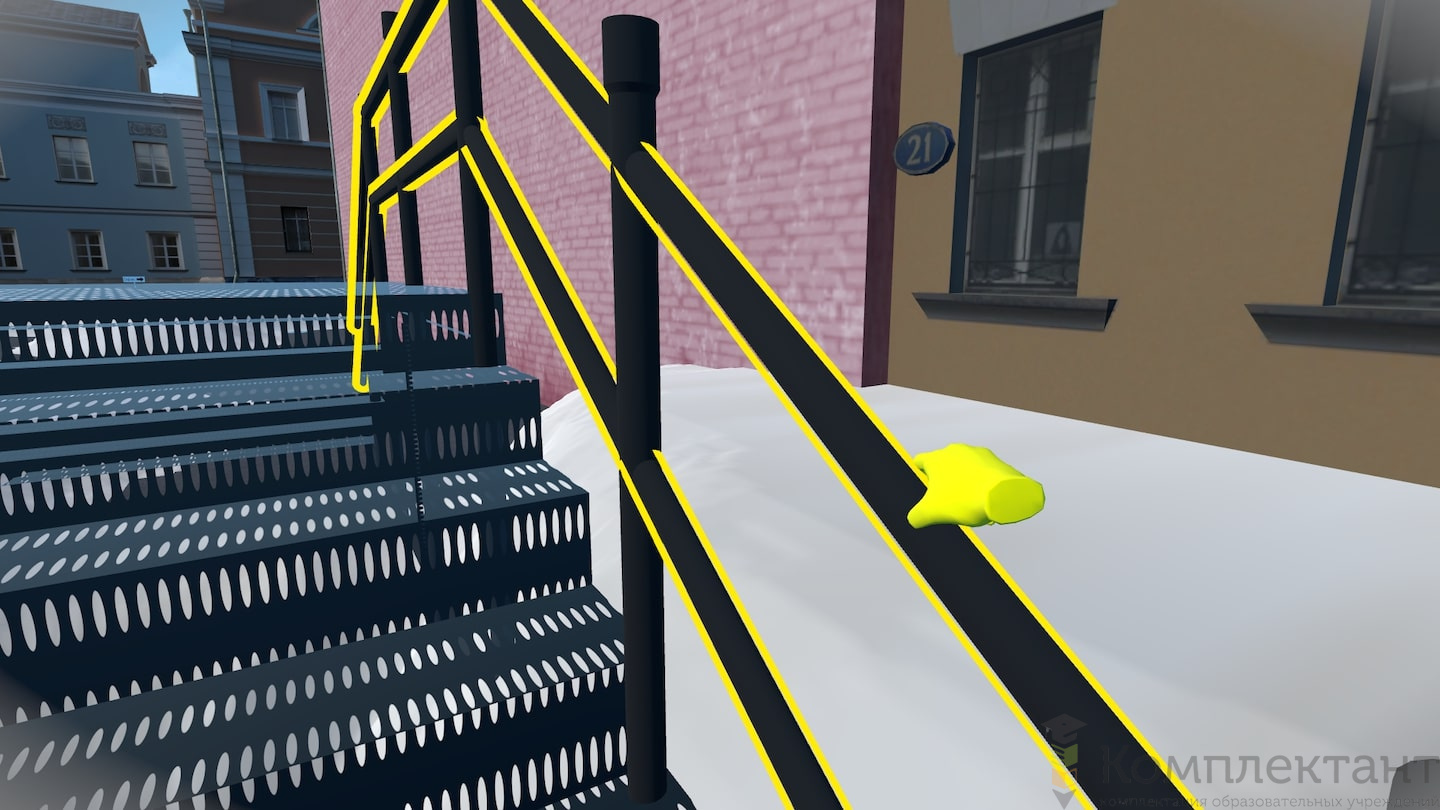Виртуальный (VR) тренажер «Безопасность по дороге на работу» воссоздает ситуацию, в которой пользователю после аномального снегопада предстоит добраться от машины, припаркованной во дворе, до входа в офис на противоположном конце двора. На его пути будут возникать различного рода препятствия (открытые люки, сосульки на крышах, сброс снега с крыши и др.), которые пользователю необходимо преодолеть.