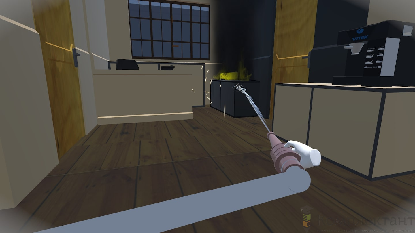 Виртуальный (VR) тренажер «Действия при пожаре в офисе» воссоздает ситуацию, в которой пользователю необходимо спастись из горящего офиса и по возможности потушить пожар. В симуляции можно выбрать условия задачи: силу (слабый, средний или сильный) и место пожара, место начала тренинга и включение оповещения.