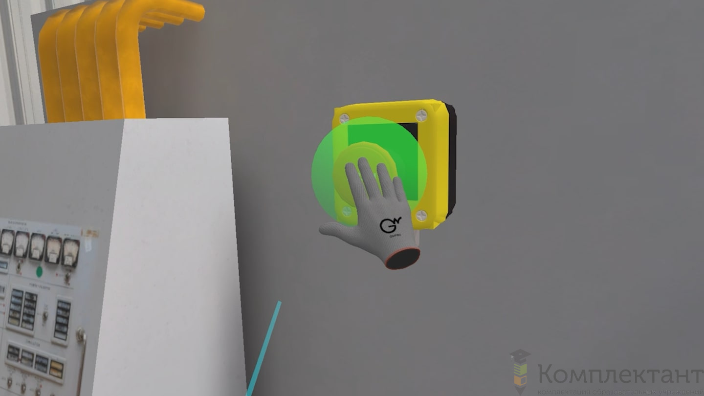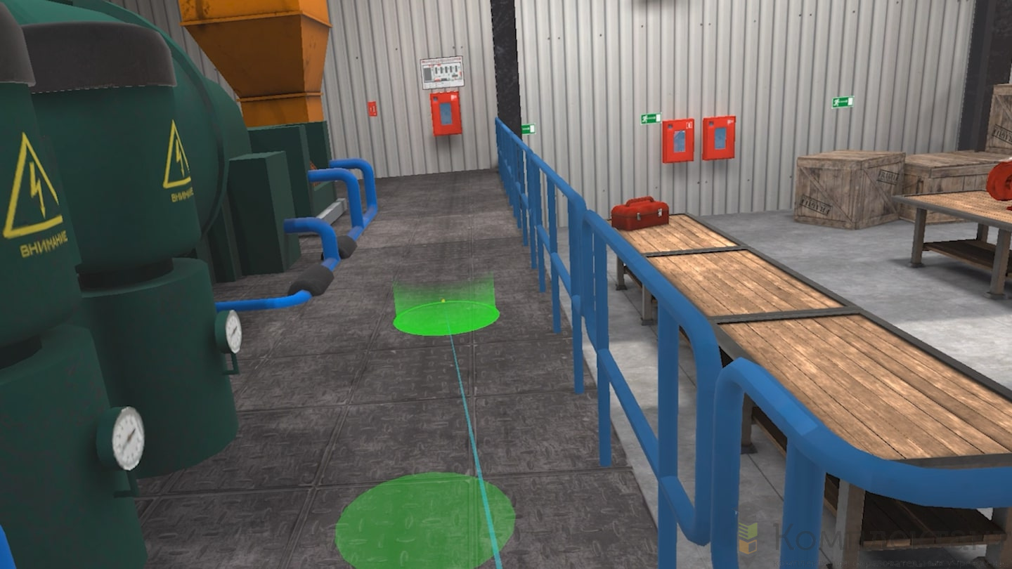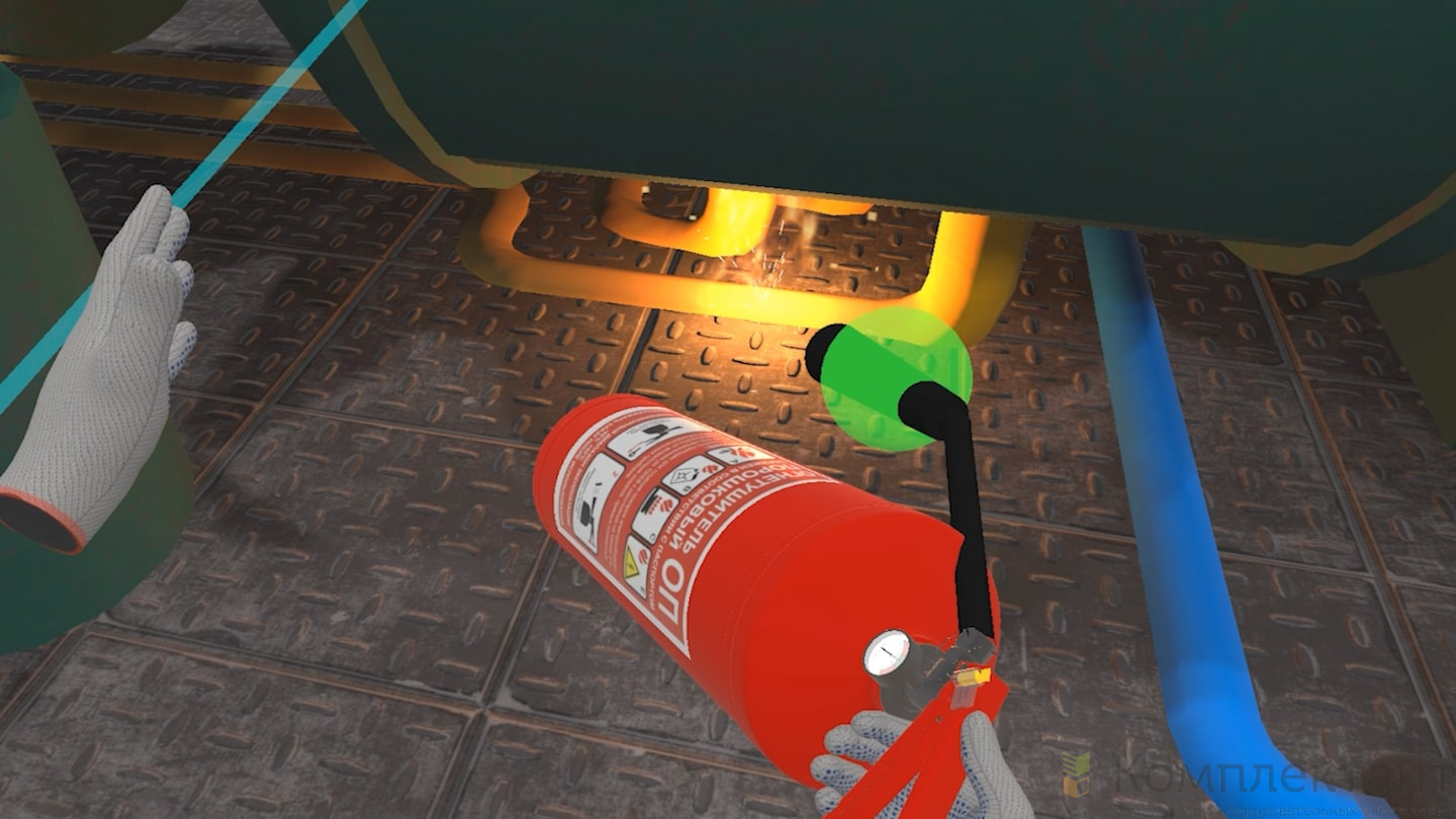 Виртуальный (VR) тренажер «Пожарная безопасность в цеху» воссоздает ситуацию возгорания в рабочем ангаре. Пользователю в процессе тренировки необходимо прекратить работу, вызвать пожарную охрану и, согласно плану, провести эвакуацию из ангара, а также применить огнетушитель.