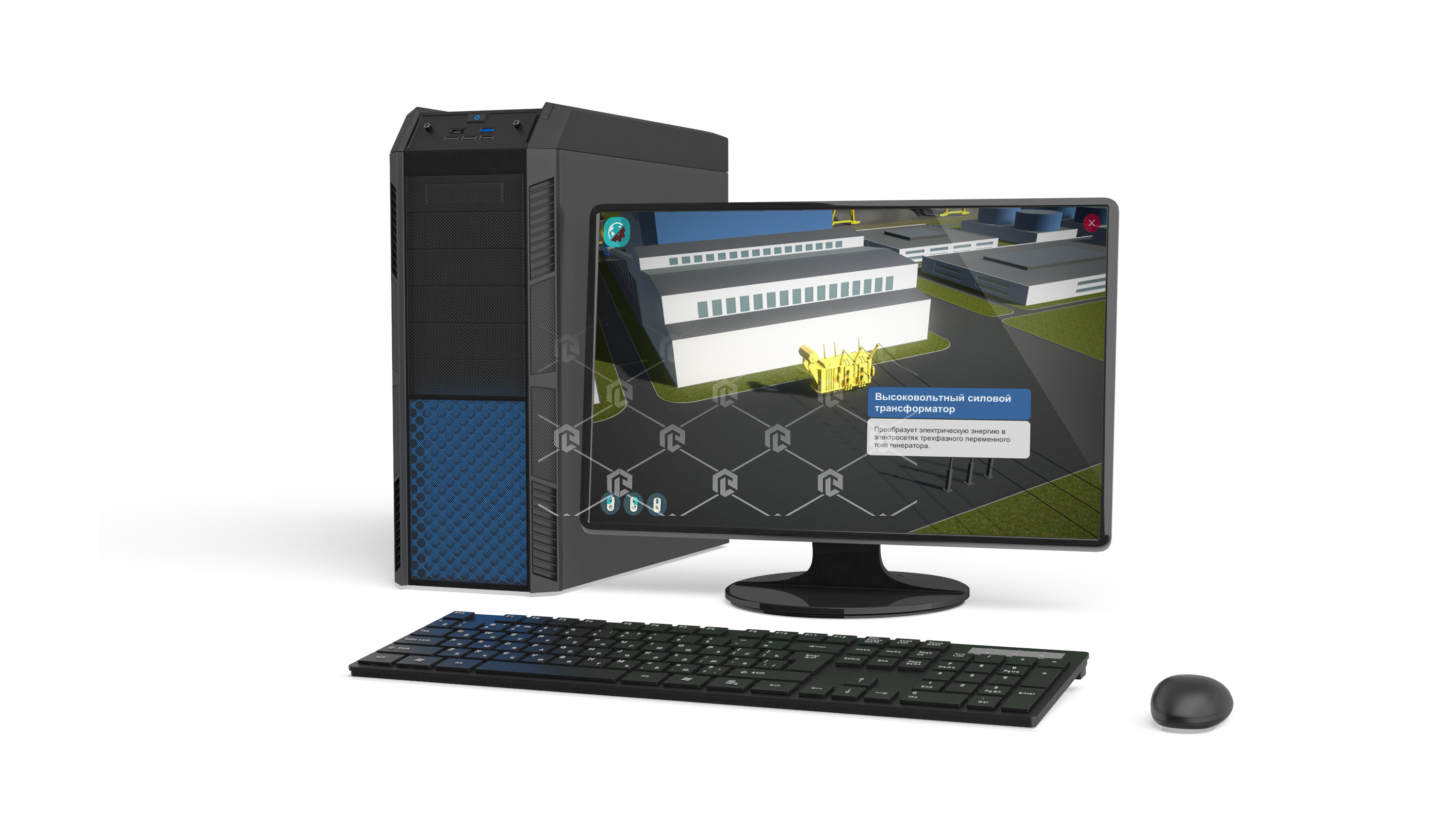 Виртуальный учебный стенд, в котором реализованы трехмерные модели оборудования силовых трансформаторов подстанции. Комплекс предназначен для исследования принципа работы и особенностей устройства трансформаторного оборудования. Позволяет исследовать основные узлы и элементы оборудования при помощи наглядной визуализации трехмерной модели с возможностью отображения интерактивных описаний, а также изучить принципиальную схему оборудования. Программное обеспечение позволяет проводить и оценивать полученные знания.