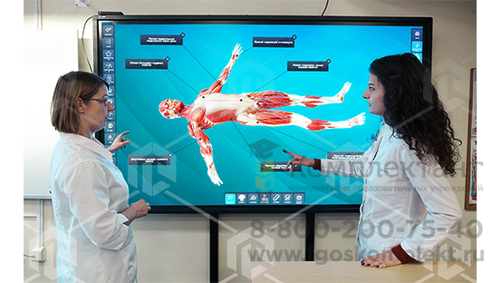 Интерактивная сенсорная панель с комплектом интерактивных обучающих модулей по направлению медицина и биология диагональю не менее 65”.