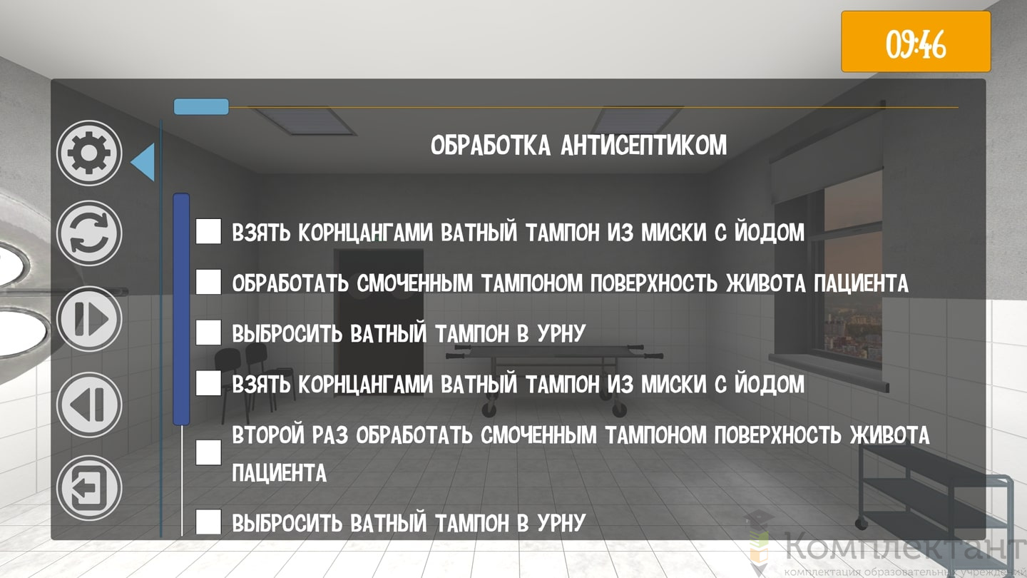 Виртуальный (VR) тренажер «Хирургическая операция Аппендэктомия» – детальная симуляция операции по вырезанию аппендицита. Проведение аппендэктомии требует помощи ассистентов. В приложении роль ассистентов выполняют виртуальные руки, выполняющие вспомогательные действия, например, придержать инструмент, убрать инструменты, сброс мусора в урну.