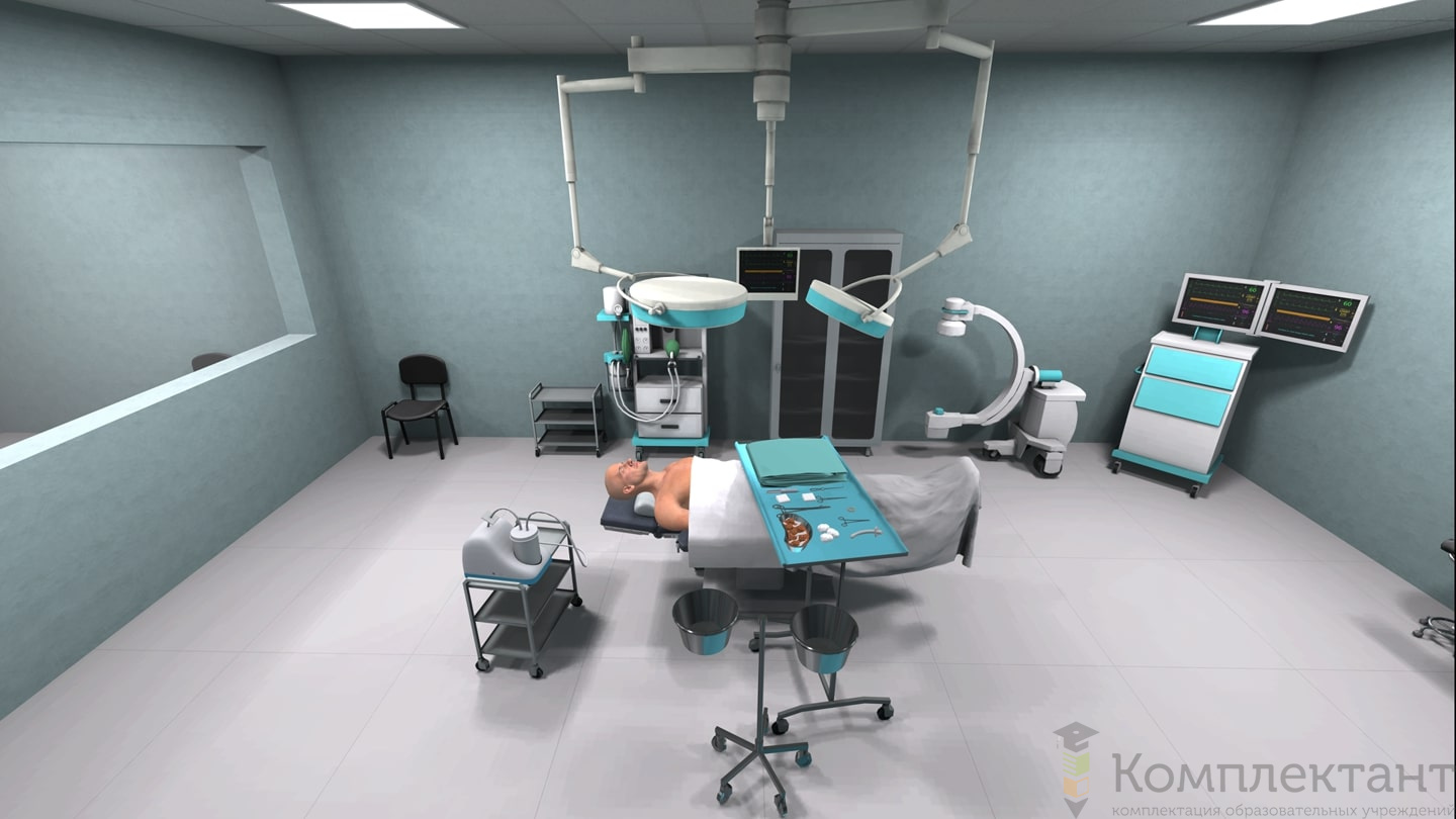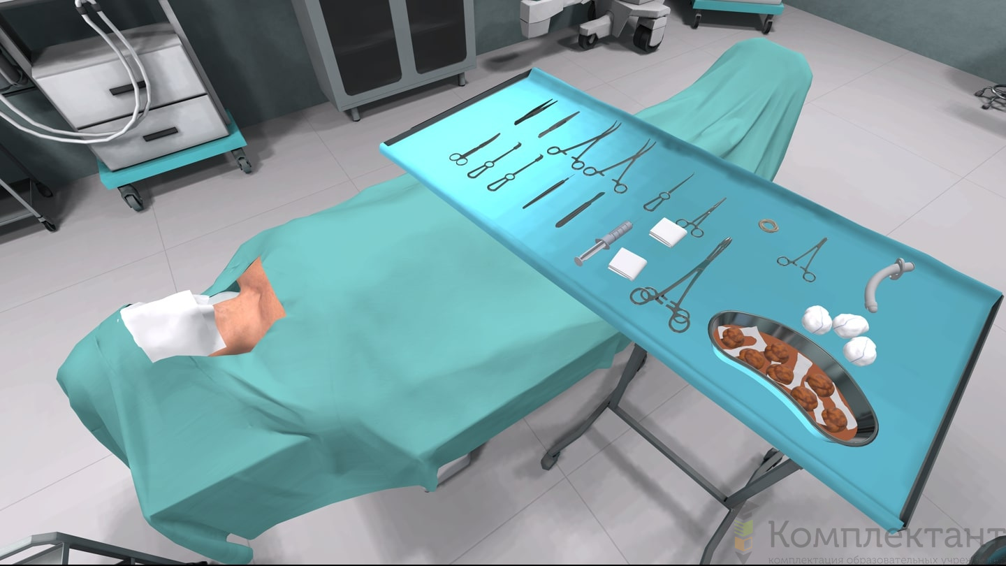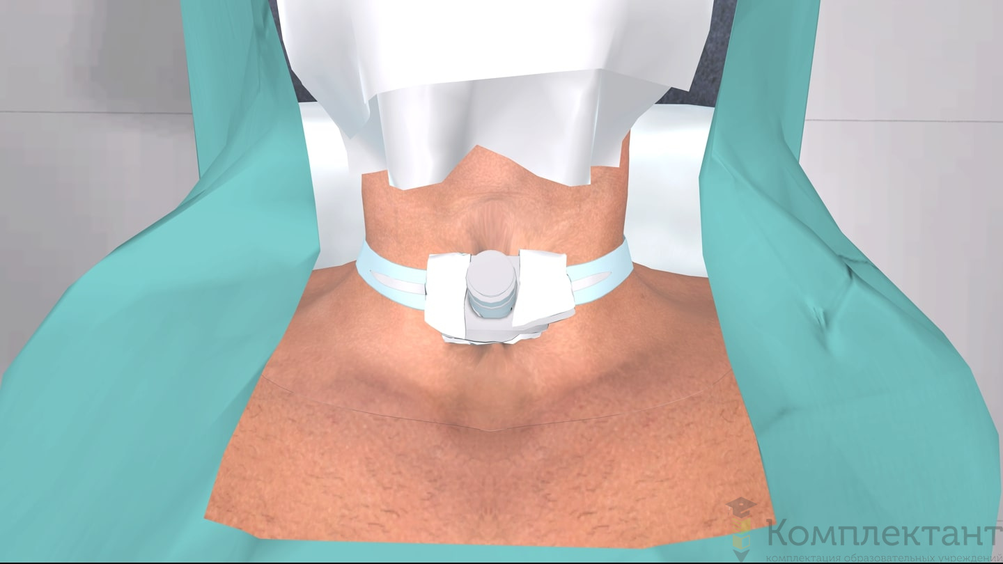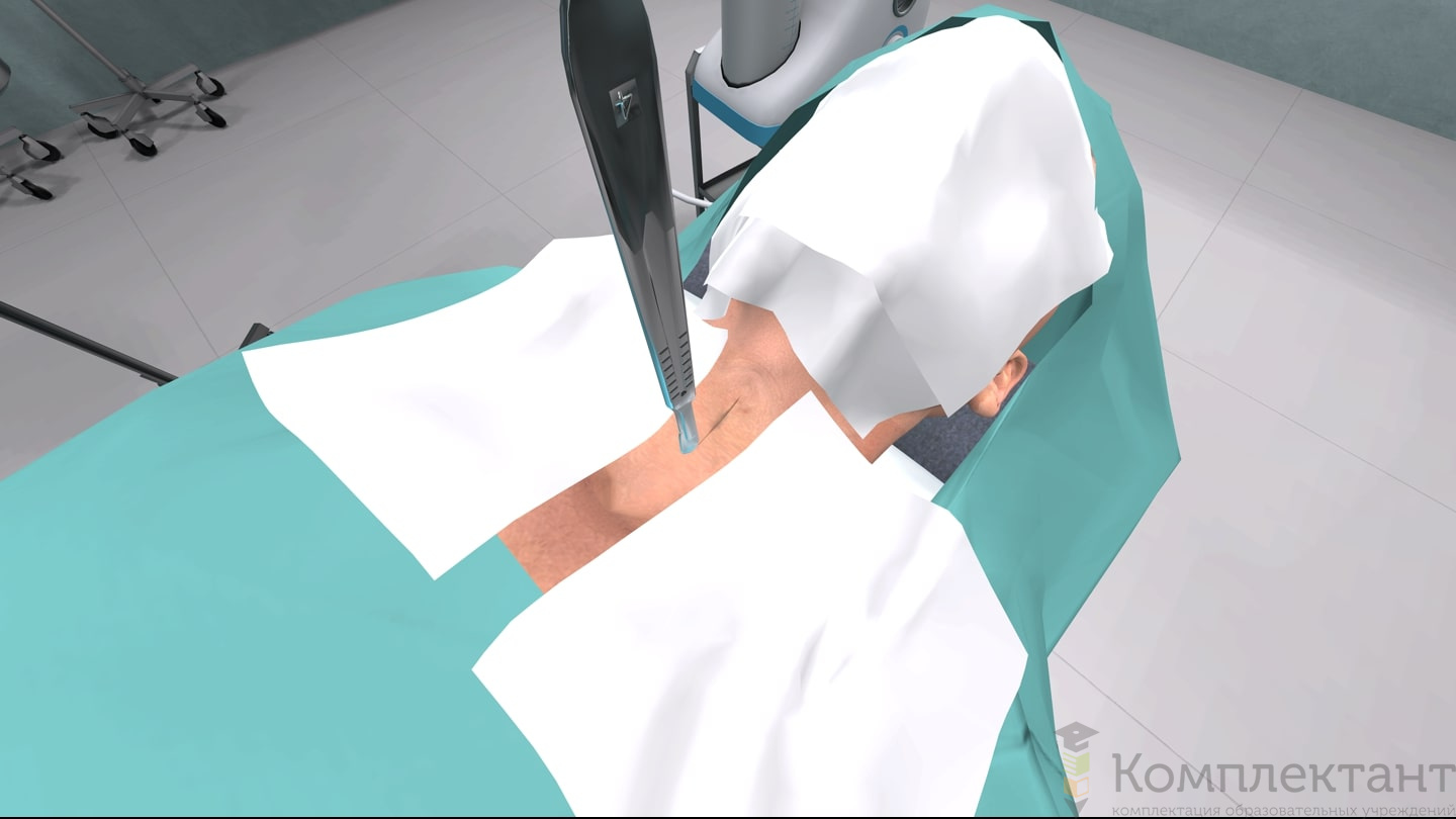 Виртуальный (VR) тренажер «Хирургическая операция Трахеостомия» – детальная симуляция операции по образованию хирургического отверстия в трахее и внедрение трубки. Проведение трахеостомии требует помощи ассистентов. В тренажере роль ассистентов выполняют виртуальные руки, выполняющие вспомогательные действия, например, придержать инструмент, убрать инструменты, сброс мусора в урну. Сначала пользователю предстоит обработать рабочую область на теле пациента, где будет происходить операция с помощью корнцанг и шарика, промоченного йодом. Затем пользователь проводит местную анестезию рабочей области с помощью шприца, после рассекает кожу для доступа к внутренним органам и отодвигает мышцы шеи, открывая доступ к трахее. Далее пользователь отсекает перешеек щитовидной железы для полноценного доступа к хрящевым полукольцам, находящимся перед трахеей, и удаляет часть полукольца хряща трахеи для дальнейшего проделывания отверстия в трахее. Оценка выполнения конкретного шага сценария заключается в точности его выполнения. К примеру, при рассечении кожи и подкожной клетчатки важна глубина и место иссечения плоти.
