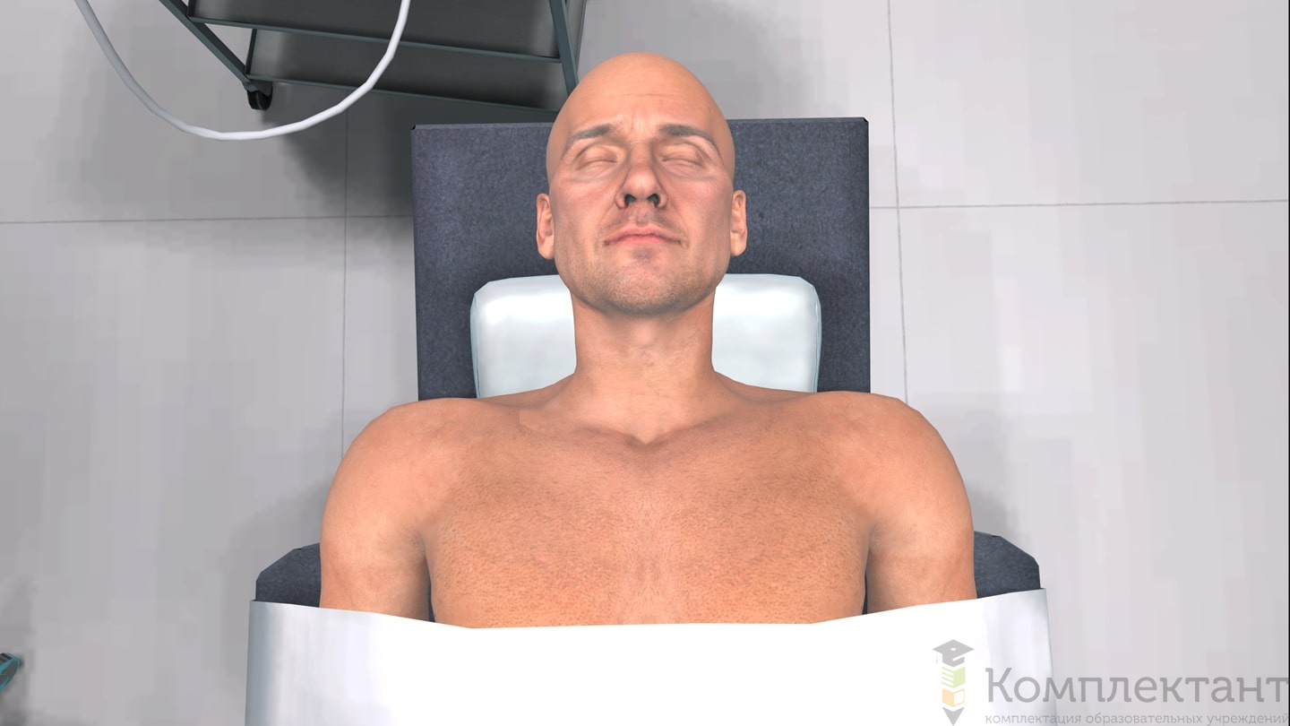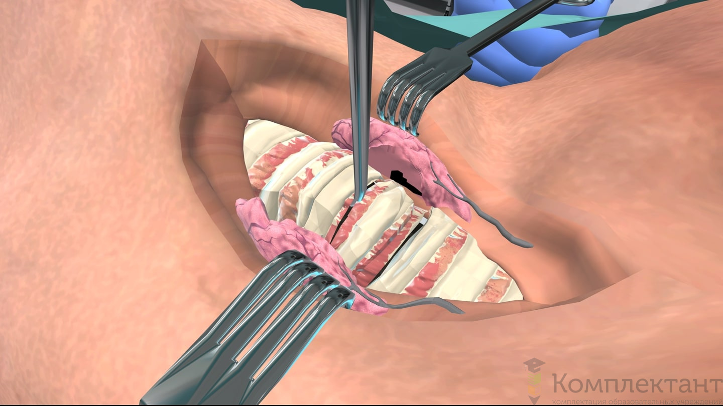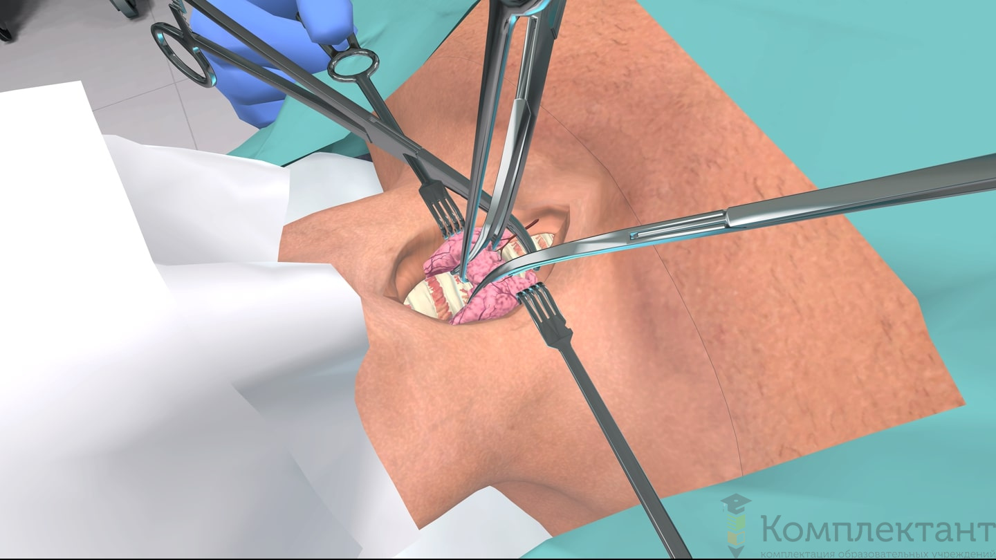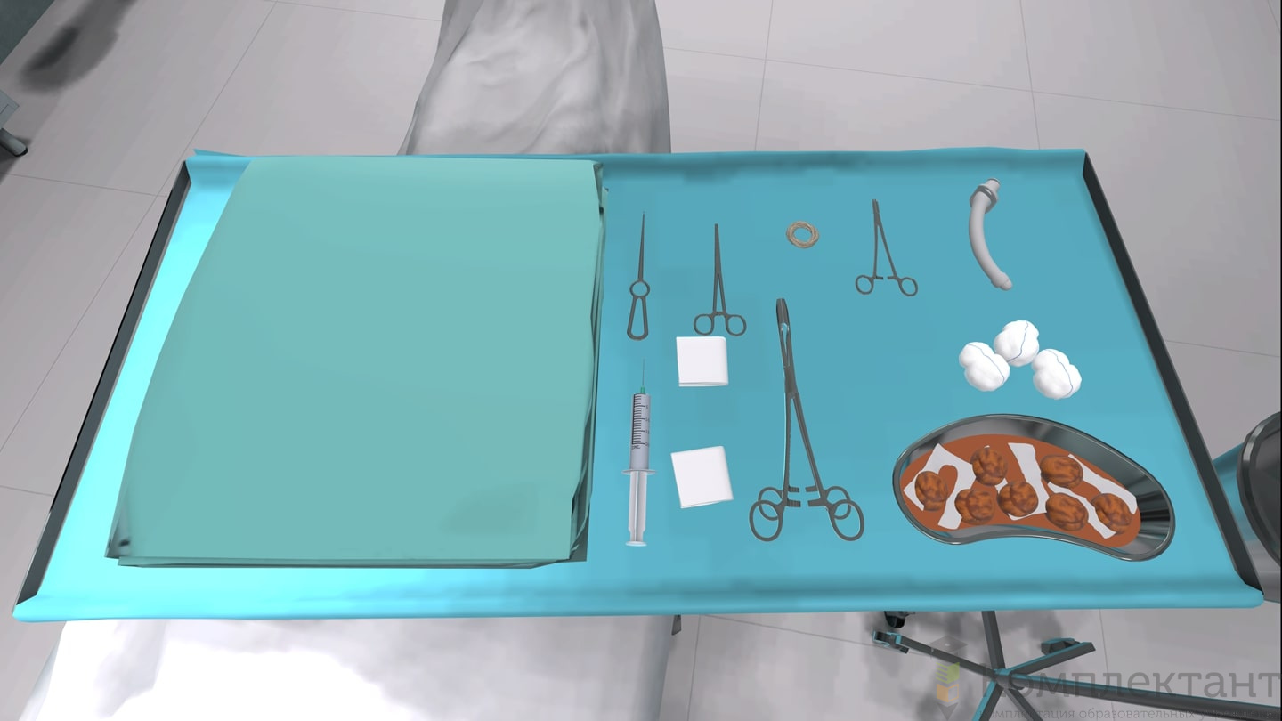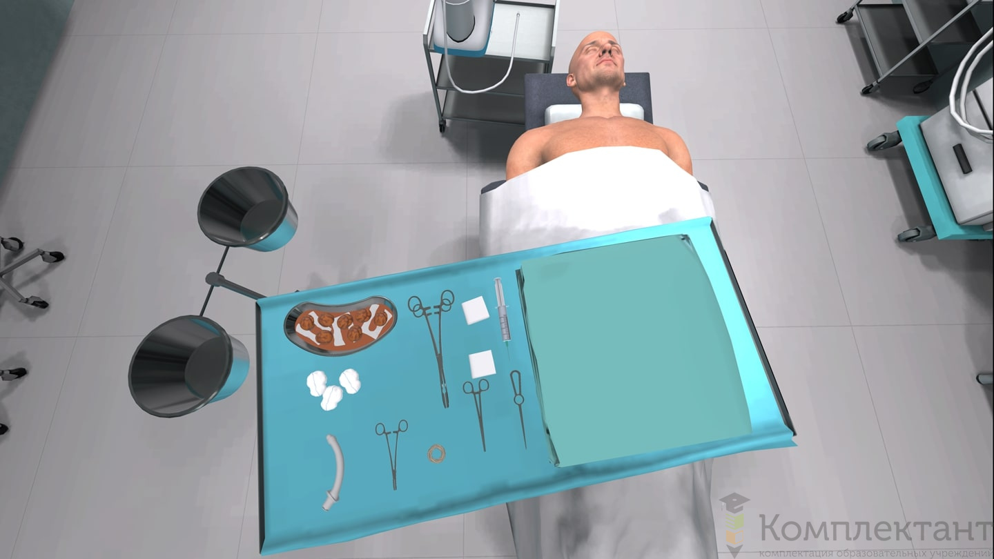 Виртуальный (VR) тренажер «Хирургическая операция Трахеостомия» – детальная симуляция операции по образованию хирургического отверстия в трахее и внедрение трубки. Проведение трахеостомии требует помощи ассистентов. В тренажере роль ассистентов выполняют виртуальные руки, выполняющие вспомогательные действия, например, придержать инструмент, убрать инструменты, сброс мусора в урну. Сначала пользователю предстоит обработать рабочую область на теле пациента, где будет происходить операция с помощью корнцанг и шарика, промоченного йодом. Затем пользователь проводит местную анестезию рабочей области с помощью шприца, после рассекает кожу для доступа к внутренним органам и отодвигает мышцы шеи, открывая доступ к трахее. Далее пользователь отсекает перешеек щитовидной железы для полноценного доступа к хрящевым полукольцам, находящимся перед трахеей, и удаляет часть полукольца хряща трахеи для дальнейшего проделывания отверстия в трахее. Оценка выполнения конкретного шага сценария заключается в точности его выполнения. К примеру, при рассечении кожи и подкожной клетчатки важна глубина и место иссечения плоти.