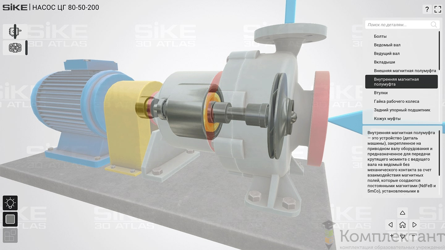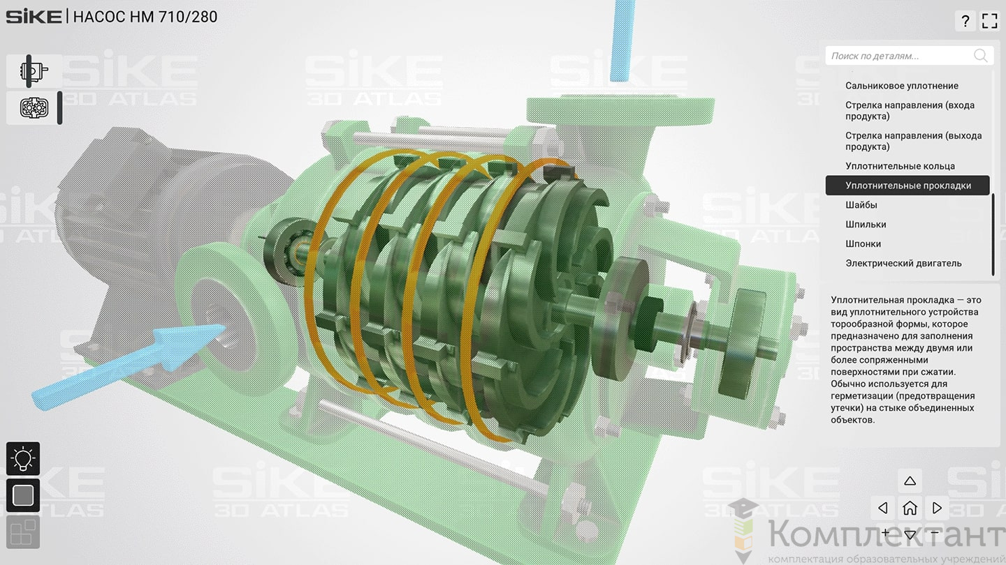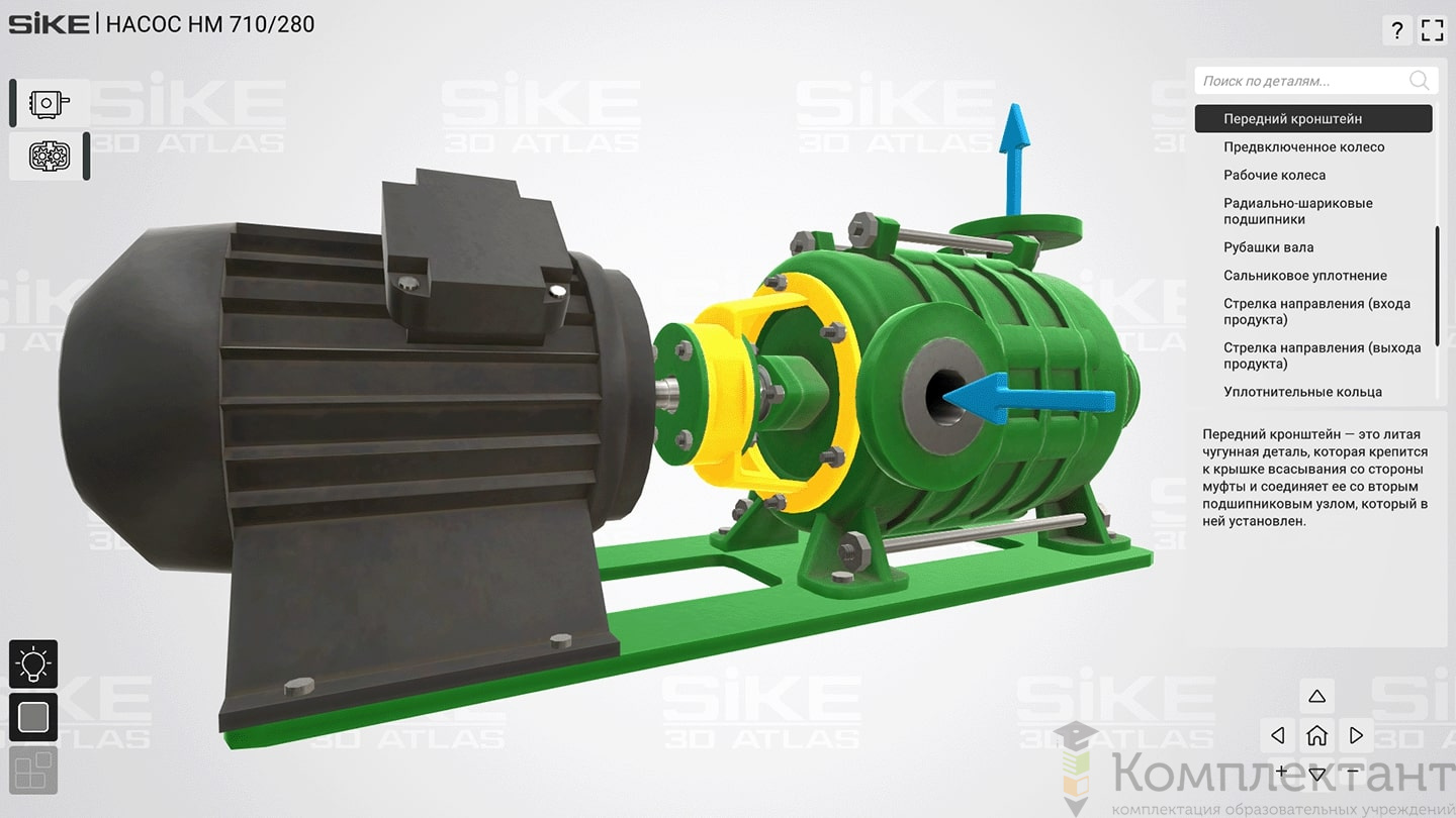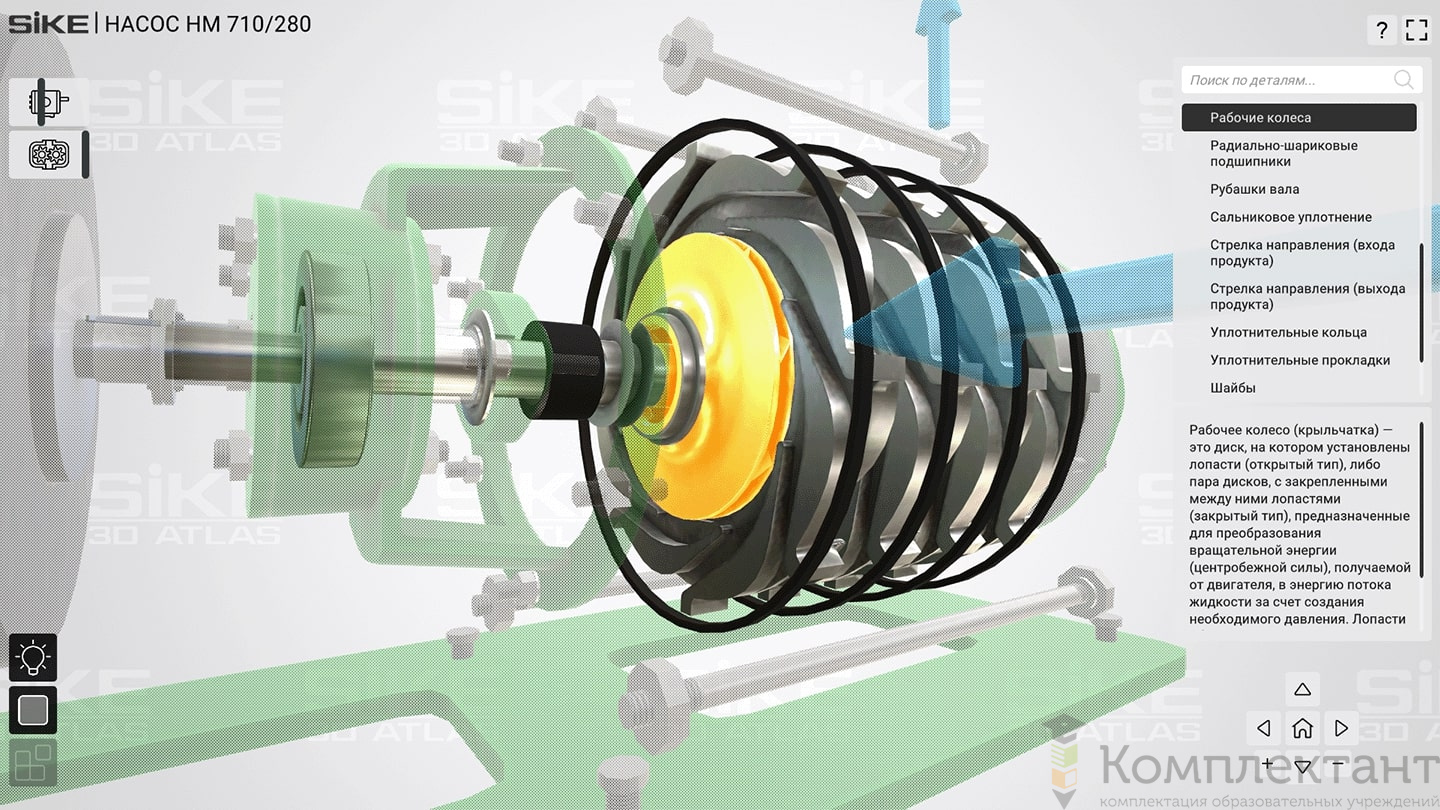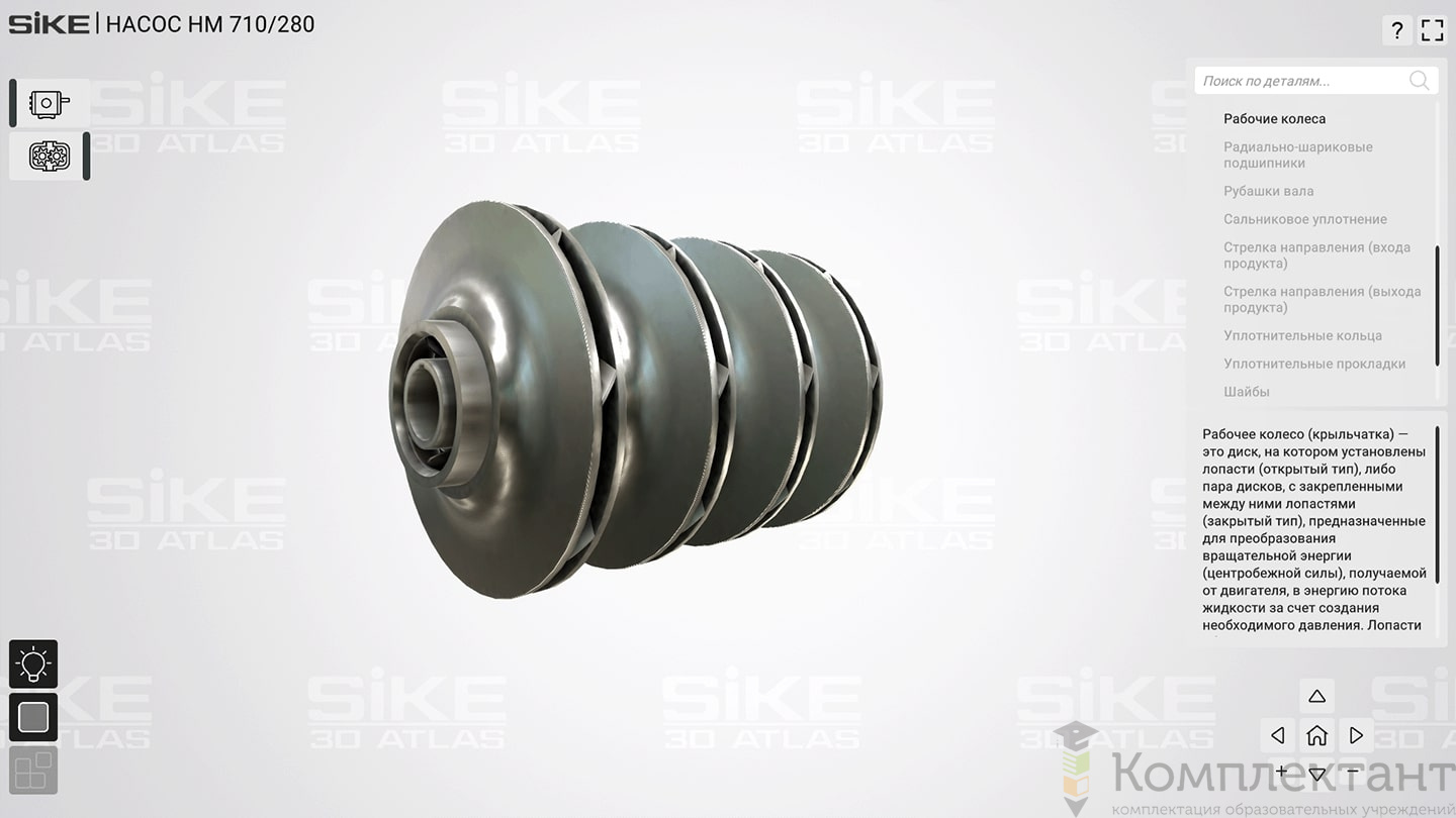 Комплект «Нефтяные насосы» включает два 3D атласа «Устройство нефтяных насосов типа НК» и «Устройство нефтяных насосов типа НМ, НПВ». Атласы дают возможность пользователю детально изучить устройства оборудования на базе реалистичных 3D моделей. В основе изучения интерактивные 3D модели реального производственного оборудования. В режиме «обучение» пользователь может вращать модель, скрывать отдельные детали, изучать внутреннее устройство, описание и назначение деталей. В режиме «тестирование» пользователь может проверить свой уровень знаний по конструкции оборудования.