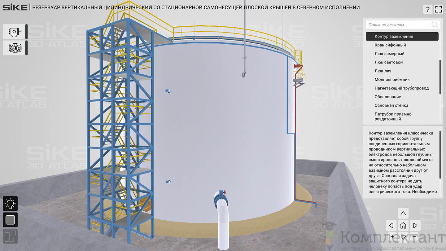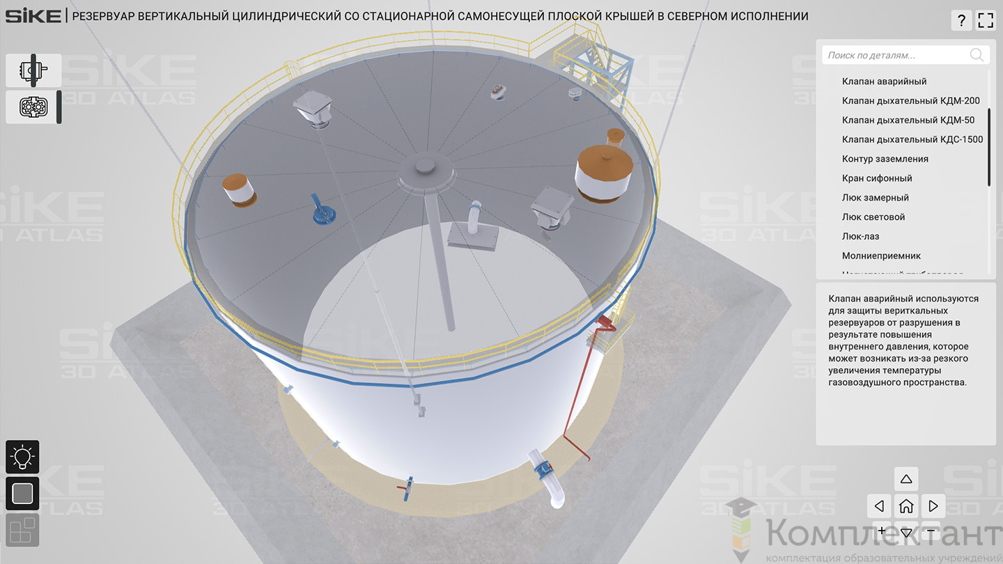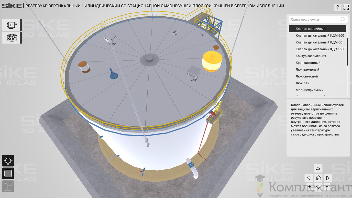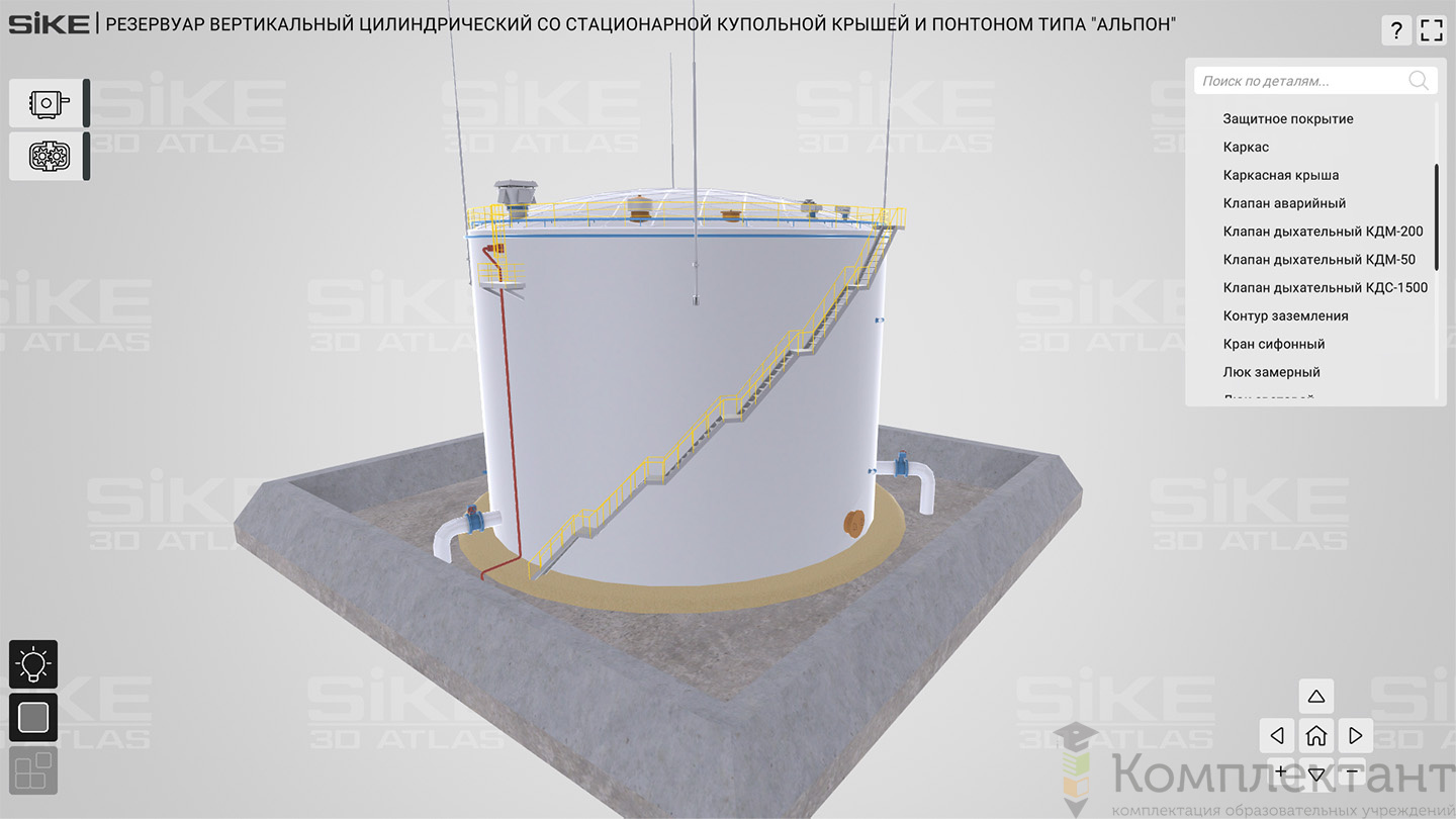 Комплект «Резервуарное оборудование» включает два 3D атласа «Вертикальные резервуары» и «Резервуары специальных конструкций». Атласы дают возможность пользователю детально изучить устройства оборудования на базе реалистичных 3D моделей. В основе изучения интерактивные 3D модели реального производственного оборудования. В режиме «обучение» пользователь может вращать модель, скрывать отдельные детали, изучать внутреннее устройство, описание и назначение деталей. В режиме «тестирование» пользователь может проверить свой уровень знаний по конструкции оборудования.