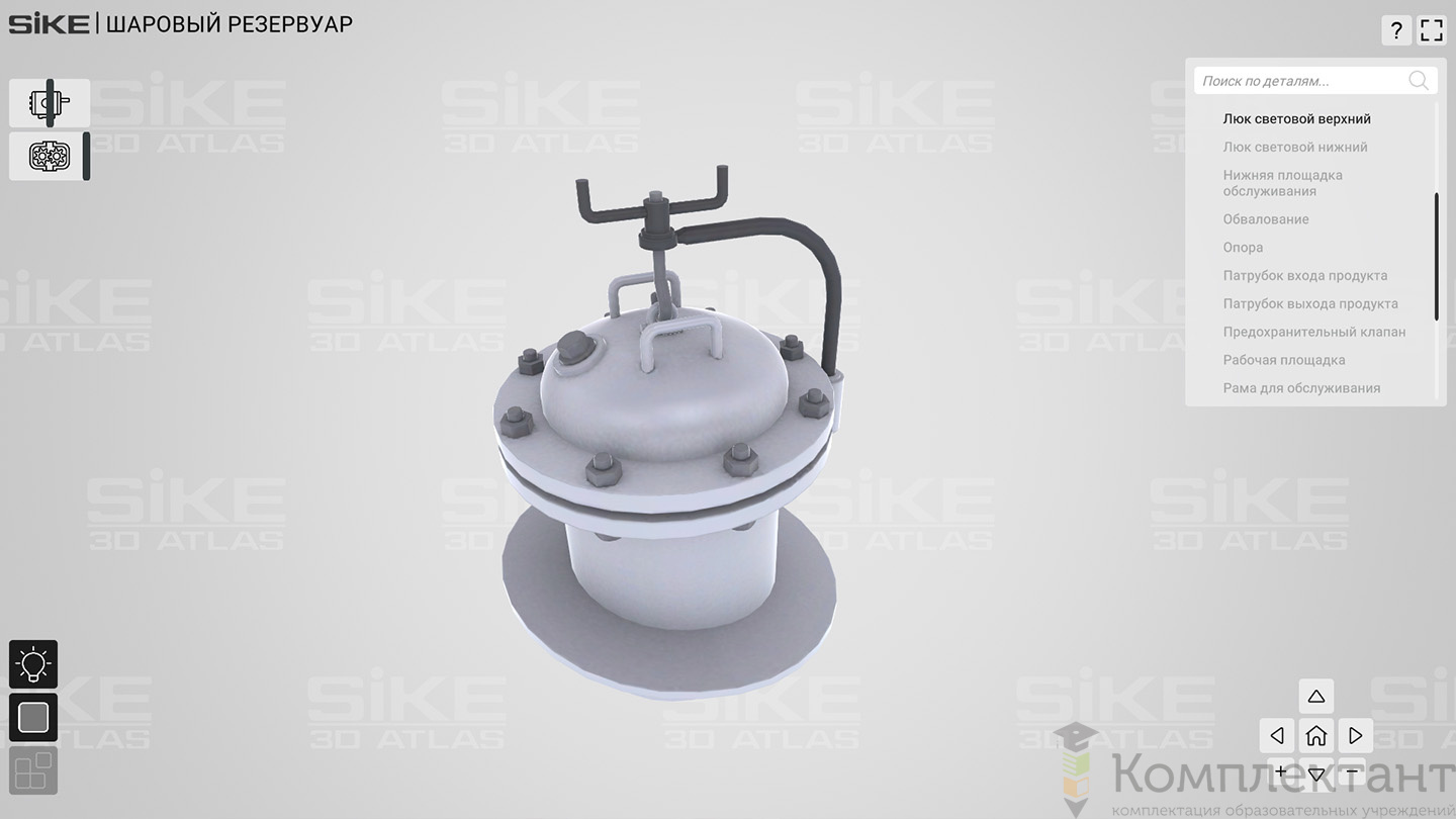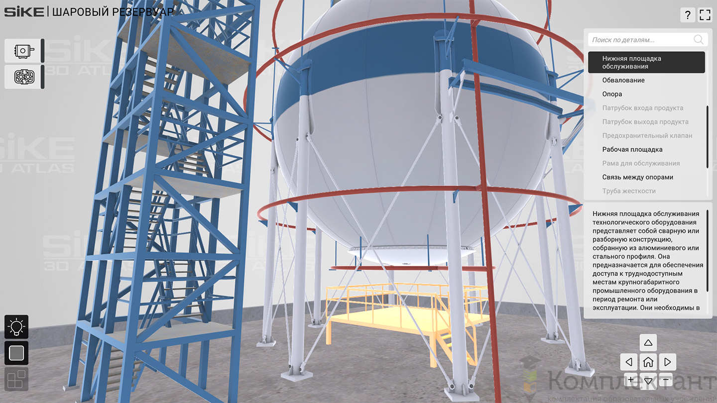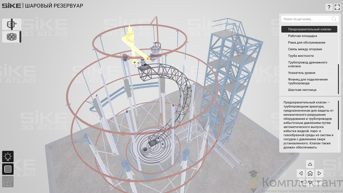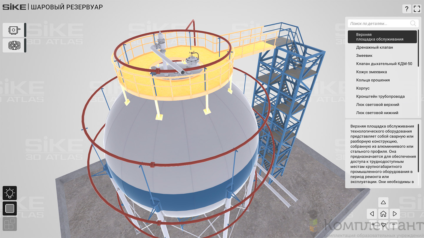 Комплект «Резервуарное оборудование» включает два 3D атласа «Вертикальные резервуары» и «Резервуары специальных конструкций». Атласы дают возможность пользователю детально изучить устройства оборудования на базе реалистичных 3D моделей. В основе изучения интерактивные 3D модели реального производственного оборудования. В режиме «обучение» пользователь может вращать модель, скрывать отдельные детали, изучать внутреннее устройство, описание и назначение деталей. В режиме «тестирование» пользователь может проверить свой уровень знаний по конструкции оборудования.