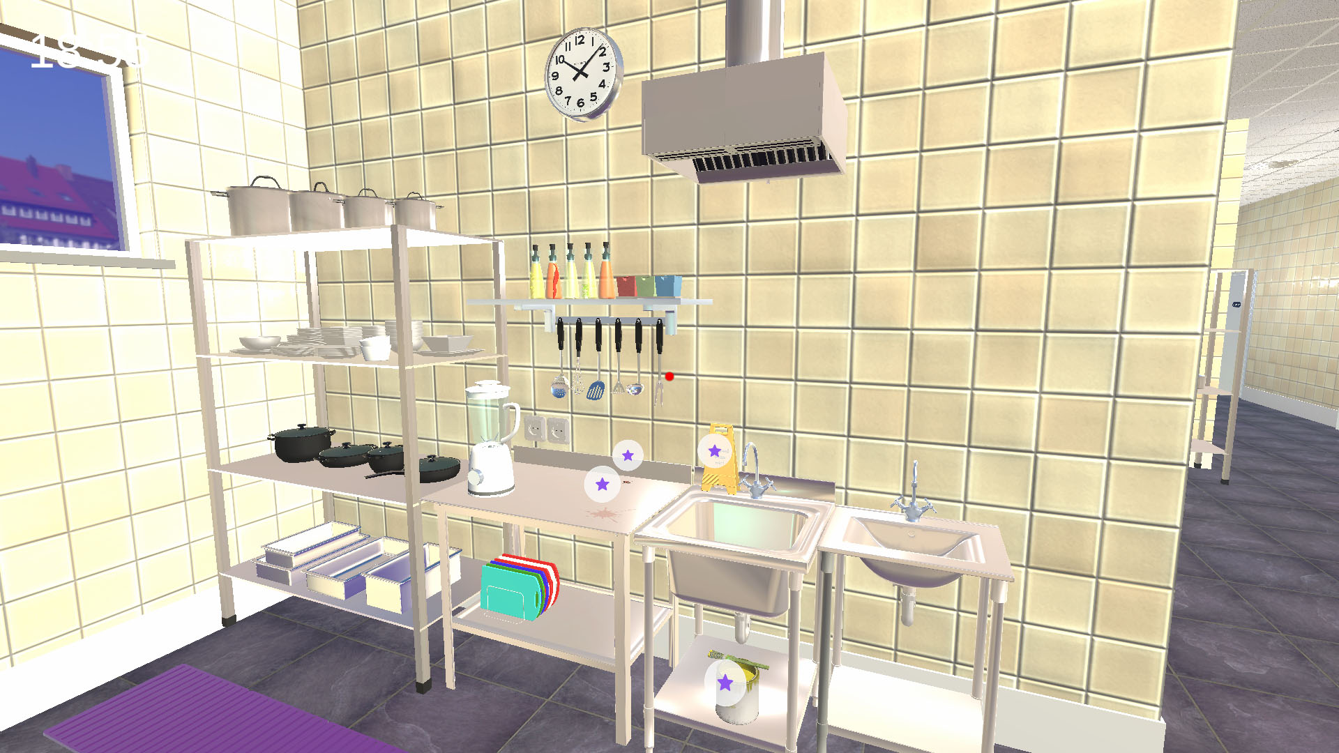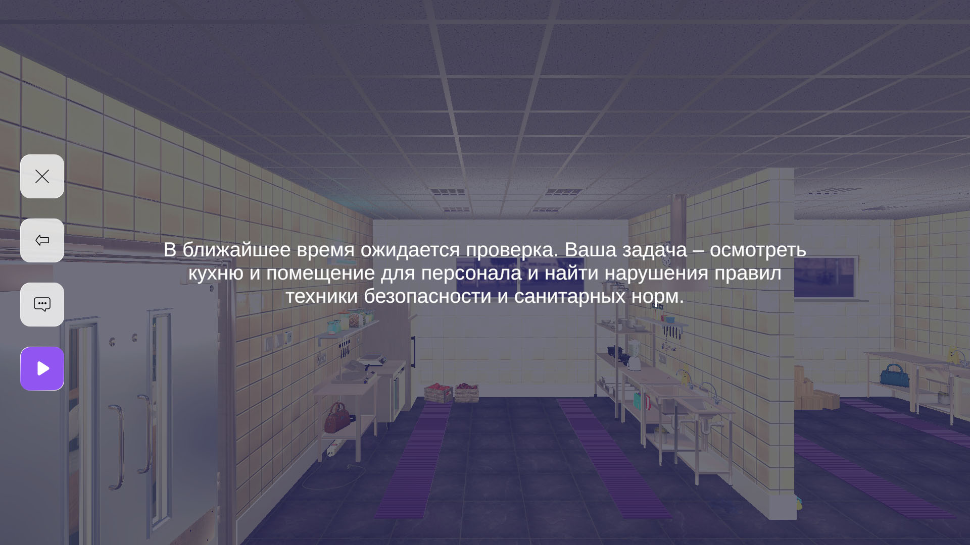 Этап 2. Выявление нарушений на рабочем месте. Пользователь исследует виртуальную кухню и отмечает обнаруженные нарушения техники безопасности и санитарных требований.