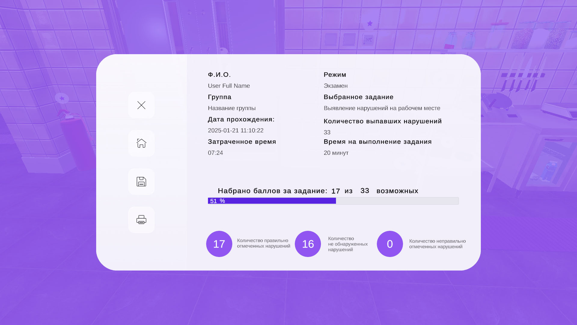 Тренажер позволяет экзаменатору гибко настраивать обучающую среду для каждого пользователя. Одной из ключевых возможностей является индивидуальная настройка пяти основных этапов прохождения тренажера.